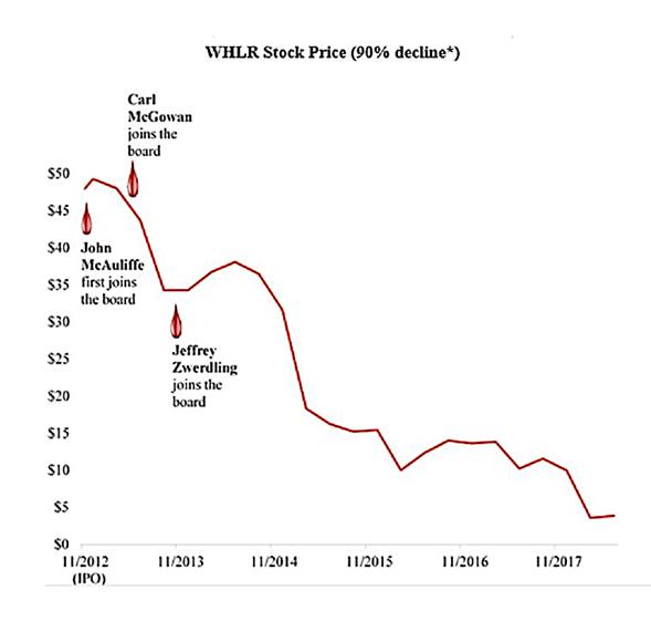 * Our calculation, according to Nasdaq price history, is based on the $6/share closing price of WHLR on its first day of public trading, 11/19/2012 (adjusted to $48/share due to the 1-for-8 reverse stock split on 3/31/17), and the $4.88/share closing price on 8/15/2018.