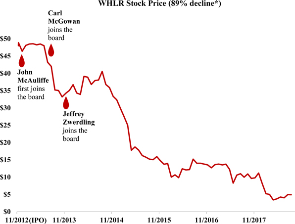 | · | John McAuliffe is an investment banker who the Company touts as having ‘participated in excess of over (sic) 200 capital raises.’ Nevertheless, under his watch, WHLR did a disastrous capital raise. He apparently lacked the requisite expertise (or perhaps he lacked the requisite backbone) to dissuade the Board from approving such a dumb deal. |