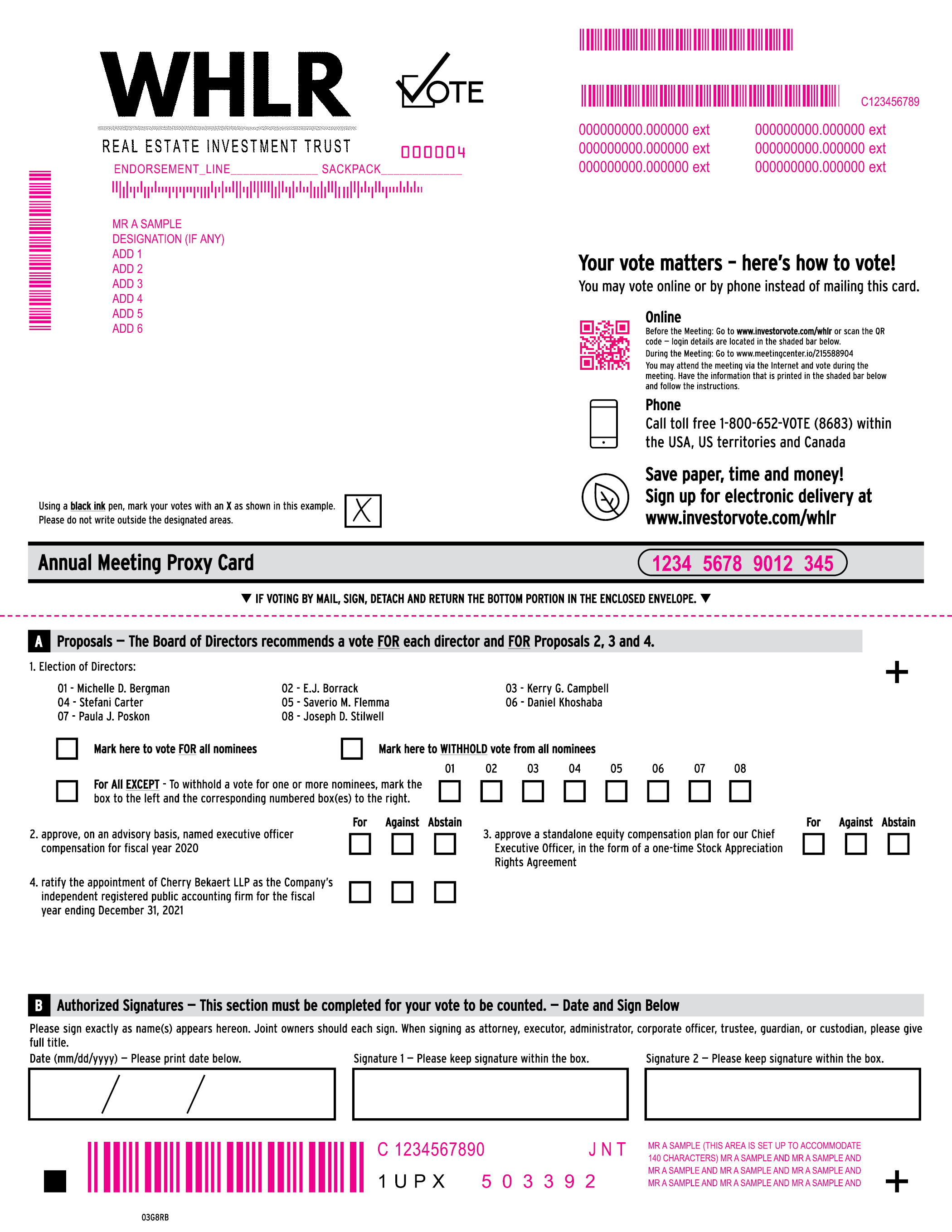 WHLR TE REAL ESTATE INVESTMENT TRUST000004ENDORSEMENT _LINE _____ SACKPACK ____ _MR A SAMPLE DESIGNATION (IF ANY) ADD1 ADD2ADD3 ADD4 ADD5ADD6 C123456789 000000000.000000 ext 000000000.000000 ext 000000000.000000 ext 000000000. 000000 ext 000000000. 000000 ext 000000000.000000 ext Your vote matters - here’s how to vote! You may vote online or by phone instead of mailing this card. Online Belore the Meeting: Go to www.l-.com/wtllr or scan the OR Authorized Signatures - This section must be completed for your vote to be counted. - Date and Sign Below Proposals - The Board of Directors recommends a vote FOR each director and FOR Proposals 2, 3 and 4. 1. Election of Directors: 01 • Michelle D. Bergman 02 • E.J. Borrack 03 • Kerry G. Campbell 04 • Stefani Carter 05 • Saverio M. Flemma 06 • Daniel Khoshaba 07 • Paula J. Poskon 08 • Joseph D. Stilwell Mark here to vote FOR all nominees Mark here to WITHHOLD vote from all nominees □ For box All to the EXCEPT To the withhold a vote for one or more nominees, mark the box to the left and the corresponding numbered box(es) to the right. 01 02 03 04 05 06 07 08 2. approve, on an advisory basis, named executive officer compensation for fiscal year 2020 For Against Abstain 3. approve a standalone equity compensation plan for our Chief Executive Officer, in the form of a one-time Stock Appreciation Rights Agreement For Against Abstain 4. ratify the appointment of Cherry Bekaert LLP as the Company’s independent registered public accounting firm for the fiscal year ending December 31, 2021Please sign exactly as name(s) appears hereon. Joint owners should each sign. When signing as attorney, executor, administrator, corporate officer, trustee, guardian, or custodian, please give full title. Date (mm/dd/yyyy) - Please print date below. Signature 1 - Please keep signature within the box. Signature 2 - Please keep signature within the box.JNT C1234567890 1UPX503392MR A SAMPLE (THIS AREA IS SET UP TO ACCOMMODATE 140 CHARACTERS) MR A SAMPLE AND MR A SAMPLE AND MR A SAMPLE AND MR A SAMPLE AND MR A SAMPLE AND MR A SAMPLE AND MR A SAMPLE AND MR A SAMPLE AND