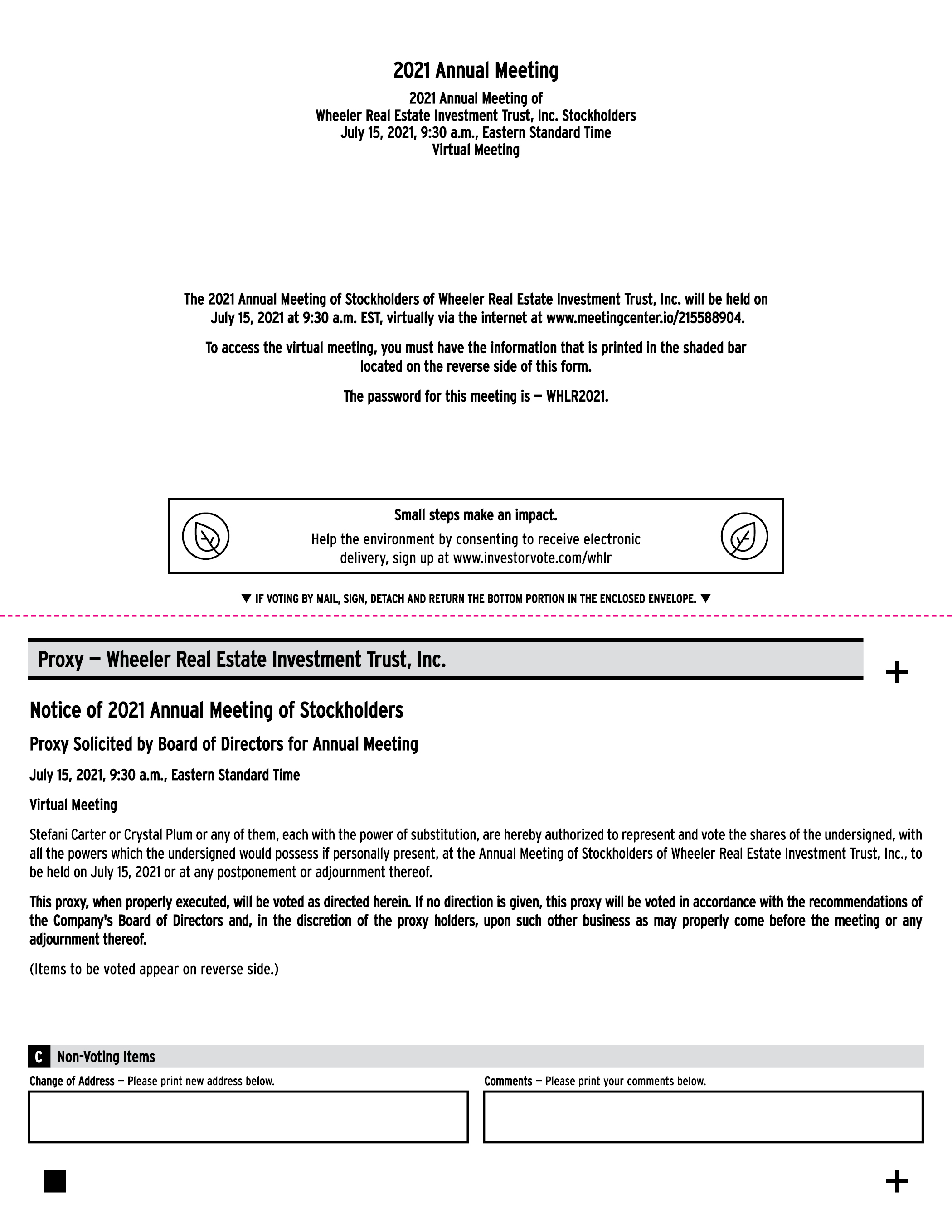 Annual Meeting of Stockholders NoticeThe 2021 Annual Meeting of Stockholders of Wheeler Real Estate Investment Trust, Inc. will be held on Thursday, July 15, 2021 at 9:30 a.m. Eastern Standard Time, virtually via the internet at www.meetingcenter.io/215588904. To access the virtual meeting, you must have the information that is printed in the shaded bar located on the reverse side of this form. The password for this meeting is WHLR2021. Proposals to be voted on at the meeting are listed below along with the Board of Directors’ recommendations. The Board of Directors recommend a vote FOR all the nominees listed and FOR Proposals 2-4: 1. Election of Directors:01 - Michelle D. Bergman02 - E.J. Borrack03 - Kerry G. Campbell04 - Stefani Carter05 - Saverio M. Flemma06 - Daniel Khoshaba07 - Paula J. Poskon08 - Joseph D. Stilwell2. approve, on an advisory basis, named executive officer compensation for fiscal year 20203. approve a standalone equity compensation plan for our Chief Executive Officer, in the form of a one-time Stock Appreciation Rights Agreement 4. ratify the appointment of Cherry Bekaert LLP as the Company’s independent registered public accounting firm for the fiscal year ending December 31, 2021PLEASE NOTE - YOU CANNOT VOTE BY RETURNING THIS NOTICE. To vote your shares you must go online or request a paper copy of the proxy materials to receive a proxy card. Here’s how to order a copy of the proxy materials and select delivery preferences: Current and future delivery requests can be submitted using the options below. If you request an email copy, you will receive an email with a link to the current meeting materials. PLEASE NOTE: You must use the number in the shaded bar on the reverse side when requesting a copy of the proxy materials. - Internet - Go to www.investorvote.com/whlr. - Phone - Call us free of charge at 1-866-641-4276.- Email - Send an email to investorvote@computershare.com with “Proxy Materials Wheeler Real Estate Investment Trust, Inc.” in the subject line. Include your full name and address, plus the number located in the shaded bar on the reverse side, and state that you want a paper copy of the meeting materials.To facilitate timely delivery, requests for a paper copy of proxy materials must be received by Friday, July 2, 2021.