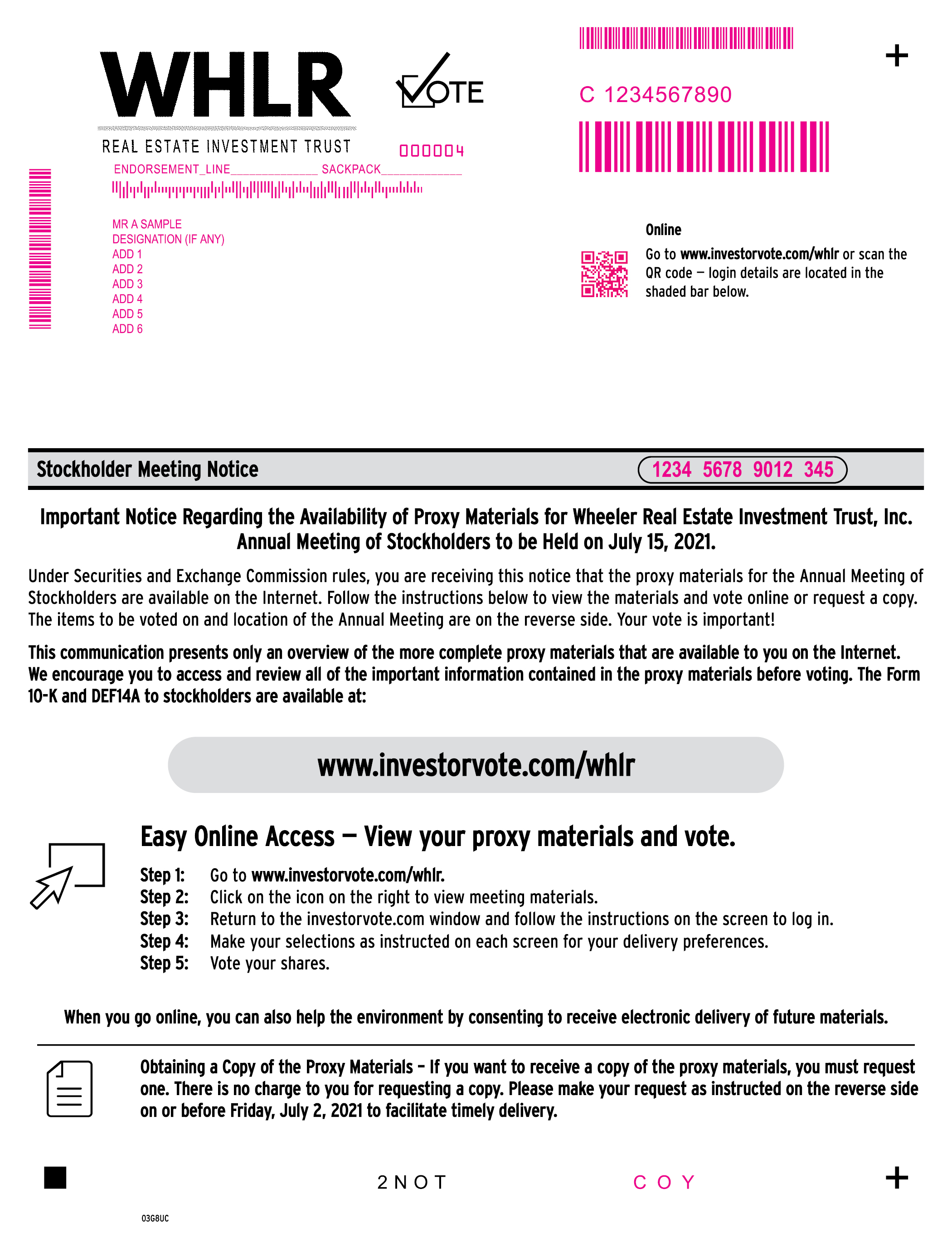 WHLR TE REAL ESTATE INVESTMENT TRUST 000004MR A SAMPLE DESIGNATION (IF ANY) ADD1 ADD2 ADD3 ADD4 ADD5 ADD6C 1234567890Online Go to www.investorvote.com/whlr or scan theOR code - login details are located in the shaded bar below. Stockholder Meeting Notice 1234 5678 9012 345Important Notice Regarding the Availability of Proxy Materials for Wheeler Real Estate Investment Trust, Inc. Annual Meeting of Stockholders to be Held on July 15, 2021. Under Securities and Exchange Commission rules, you are receiving this notice that the proxy materials for the Annual Meeting of Stockholders are available on the Internet. Follow the instructions below to view the materials and vote online or request a copy. The items to be voted on and location of the Annual Meeting are on the reverse side. Your vote is important! This communication presents only an overview of the more complete proxy materials that are available to you on the Internet. We encourage you to access and review all of the important information contained in the proxy materials before voting. The Form 10-K and DEn4A to stockholders are available at:www.investorvote.com/whlrEasy Online Access - View your proxy materials and vote. Step 1: Step 2: Step 3: Step 4: Step 5: Go to www.investorvote.com/whlr. Click on the icon on the right to view meeting materials. Return to the investorvote.com window and follow the instructions on the screen to log in. Make your selections as instructed on each screen for your delivery preferences. Vote your shares. When you go online, you can also help the environment by consenting to receive electronic delivery of future materials. Obtaining a Copy of the Proxy Materials - If you want to receive a copy of the proxy materials, you must request one. There is no charge to you for requesting a copy. Please make your request as instructed on the reverse side on or before Friday, July 2, 2021 to facilitate timely delivery. 2NOTCOY03G8UC