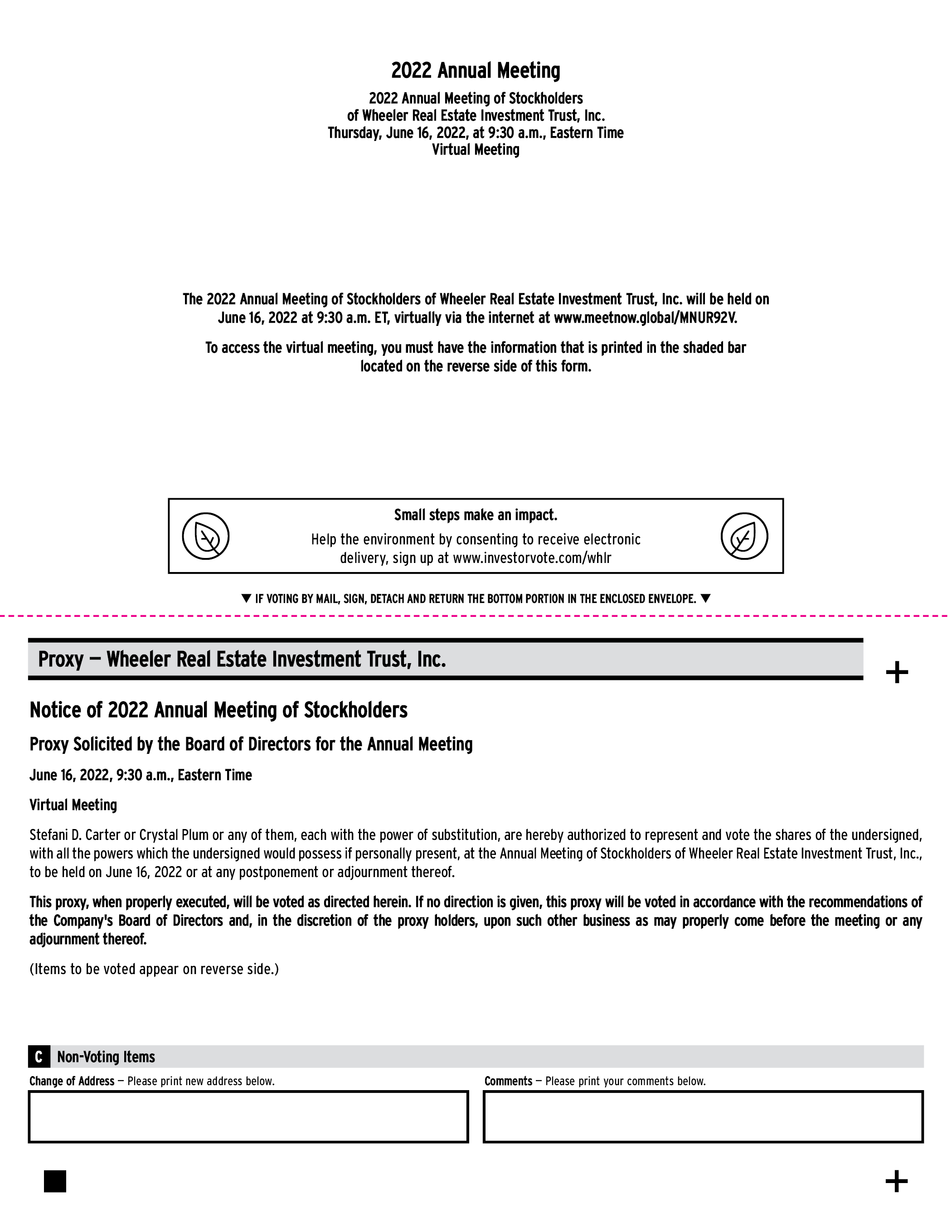 2022 Annual Meeting 2022 Annual Meeting of Stockholders of Wheeler Real Estate Investment Trust, Inc. Thursday, June 16, 2022, at 9:30 a.m., Eastern Time Virtual Meeting The 2022 Annual Meeting of Stockholders of Wheeler Real Estate Investment Trust, Inc. will be held on June 16, 2022 at 9:30 a.m. ET, virtually via the internet at www.meetnow.global/MNUR92V. To access the virtual meeting, you must have the information that is printed in the shaded bar located on the reverse side of this form. Small steps make an impact. Help the environment by consenting to receive electronic delivery, sign up at www.investorvote.com/whlr qIF VOTING BY MAIL, SIGN, DETACH AND RETURN THE BOTTOM PORTION IN THE ENCLOSED ENVELOPE. Proxy — Wheeler Real Estate Investment Trust, Inc. Notice of 2022 Annual Meeting of Stockholders Proxy Solicited by the Board of Directors for the Annual Meeting June 16, 2022, 9:30 a.m., Eastern Time Virtual Meeting Stefani D. Carter or Crystal Plum or any of them, each with the power of substitution, are hereby authorized to represent and vote the shares of the undersigned, with all the powers which the undersigned would possess if personally present, at the Annual Meeting of Stockholders of Wheeler Real Estate Investment Trust, Inc., to be held on June 16, 2022 or at any postponement or adjournment thereof. This proxy, when properly executed, will be voted as directed herein. If no direction is given, this proxy will be voted in accordance with the recommendations of the Company’s Board of Directors and, in the discretion of the proxy holders, upon such other business as may properly come before the meeting or any adjournment thereof. (Items to be voted appear on reverse side.) Non-Voting Items Change of Address — Please print new address below. Comments — Please print your comments below.