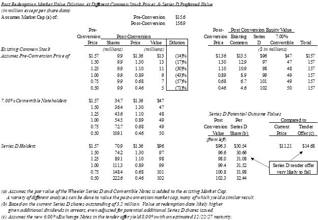 Post Redemption Market Value Dilution At Different Common Stock Prices & Series D Preferred Value (in million except per share data) Assumes Market Cap (a) of: Pre-Conversion $ 15.6 Post-Conversion 156.9 Pre- Conversion Post-Conversion Price Shares Price Value Dilution Existing Common Stock (millions) (millions) Assumes Pre-Conversion Price of $ 1.57 9.9 $ 1.36 $ 13 (14 )% 1.50 9.9 1.30 13 (17 )% 1.25 9.9 1.10 11 (30 )% 1.00 9.9 0.89 9 (43 )% 0.09 0.75 9.9 0.68 7 (57 )% 0.61 0.50 9.9 0.46 5 (71 )% 0.30 7.00% Convertible Noteholders $ 1.57 34.7 $ 1.36 $ 47 1.50 36.4 1.30 47 1.25 43.6 1.10 48 1.00 54.5 0.89 49 0.75 72.7 0.68 49 0.50 109.1 0.46 50 Series D Holders $ 1.57 70.9 $ 1.36 $ 96 1.50 74.2 1.30 97 1.25 89.1 1.10 98 1.00 111.3 0.89 99 0.75 148.4 0.68 101 0.50 222.6 0.46 102 Post- Post Conversion Equity Value Conversion Existing Series 7.00% Price Common D Convertible Total ($ in millions) $ 1.36 $ 13.5 $ 96 $ 47 $ 157 1.30 12.9 97 47 157 1.10 10.9 98 48 157 0.89 8.9 99 49 157 0.68 6.7 101 49 157 0.46 4.6 102 50 157 Series D Potential Outcome Values Post Per Compared to Conversion Series D Current Tender Value Share (b) Price Offer (c) (from left) $ 96.3 $ 30.54 $ 11.21 $ 14.68 96.6 30.66 98.0 31.08 99.4 31.52 100.8 31.98 102.3 32.44