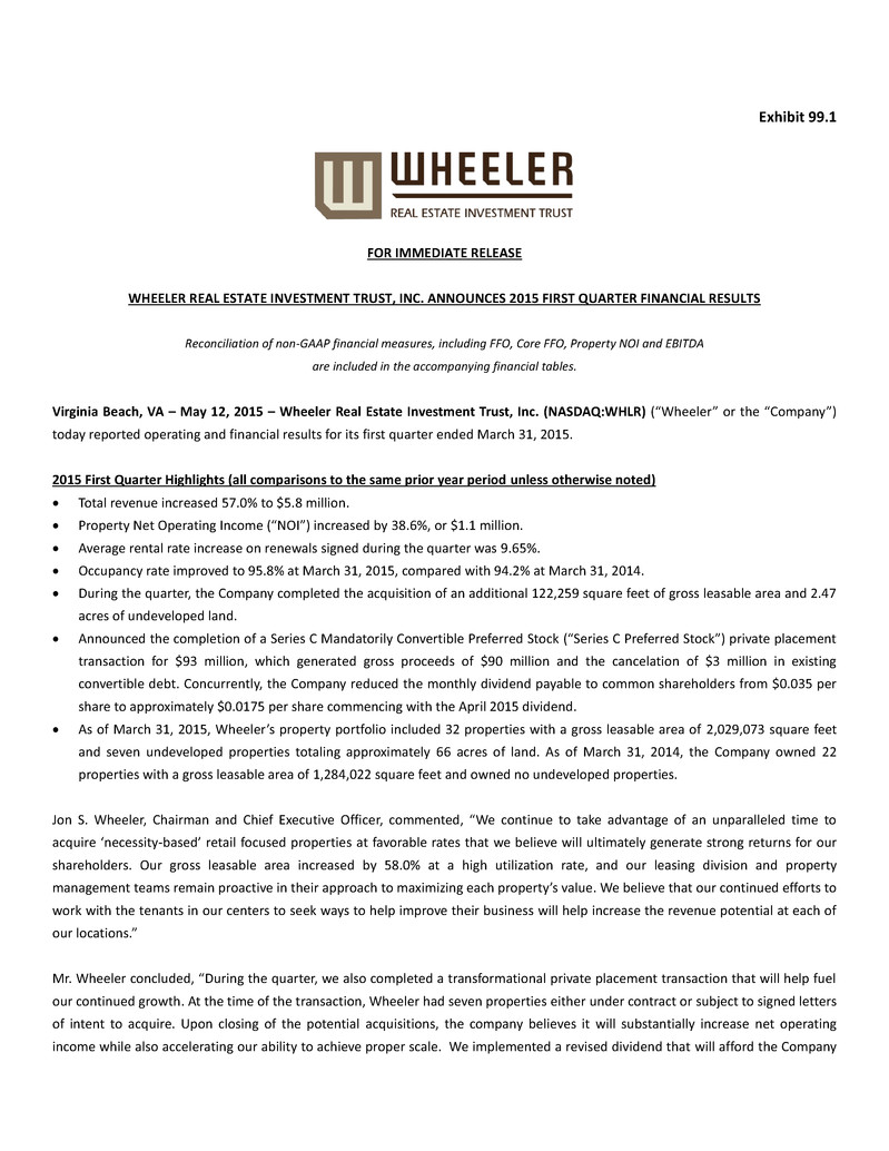 Exhibit 99.1 FOR IMMEDIATE RELEASE WHEELER REAL ESTATE INVESTMENT TRUST, INC. ANNOUNCES 2015 FIRST QUARTER FINANCIAL RESULTS Reconciliation of non-GAAP financial measures, including FFO, Core FFO, Property NOI and EBITDA are included in the accompanying financial tables. Virginia Beach, VA – May 12, 2015 – Wheeler Real Estate Investment Trust, Inc. (NASDAQ:WHLR) (“Wheeler” or the “Company”) today reported operating and financial results for its first quarter ended March 31, 2015. 2015 First Quarter Highlights (all comparisons to the same prior year period unless otherwise noted) Total revenue increased 57.0% to $5.8 million. Property Net Operating Income (“NOI”) increased by 38.6%, or $1.1 million. Average rental rate increase on renewals signed during the quarter was 9.65%. Occupancy rate improved to 95.8% at March 31, 2015, compared with 94.2% at March 31, 2014. During the quarter, the Company completed the acquisition of an additional 122,259 square feet of gross leasable area and 2.47 acres of undeveloped land. Announced the completion of a Series C Mandatorily Convertible Preferred Stock (“Series C Preferred Stock”) private placement transaction for $93 million, which generated gross proceeds of $90 million and the cancelation of $3 million in existing convertible debt. Concurrently, the Company reduced the monthly dividend payable to common shareholders from $0.035 per share to approximately $0.0175 per share commencing with the April 2015 dividend. As of March 31, 2015, Wheeler’s property portfolio included 32 properties with a gross leasable area of 2,029,073 square feet and seven undeveloped properties totaling approximately 66 acres of land. As of March 31, 2014, the Company owned 22 properties with a gross leasable area of 1,284,022 square feet and owned no undeveloped properties. Jon S. Wheeler, Chairman and Chief Executive Officer, commented, “We continue to take advantage of an unparalleled time to acquire ‘necessity-based’ retail focused properties at favorable rates that we believe will ultimately generate strong returns for our shareholders. Our gross leasable area increased by 58.0% at a high utilization rate, and our leasing division and property management teams remain proactive in their approach to maximizing each property’s value. We believe that our continued efforts to work with the tenants in our centers to seek ways to help improve their business will help increase the revenue potential at each of our locations.” Mr. Wheeler concluded, “During the quarter, we also completed a transformational private placement transaction that will help fuel our continued growth. At the time of the transaction, Wheeler had seven properties either under contract or subject to signed letters of intent to acquire. Upon closing of the potential acquisitions, the company believes it will substantially increase net operating income while also accelerating our ability to achieve proper scale. We implemented a revised dividend that will afford the Company