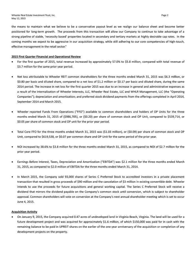 Wheeler Real Estate Investment Trust, Inc. Page 2 May 12, 2015 the means to maintain what we believe to be a conservative payout level as we realign our balance sheet and become better positioned for long-term growth. The proceeds from this transaction will allow our Company to continue to take advantage of a strong pipeline of stable, ‘necessity based’ properties located in secondary and tertiary markets at highly desirable cap rates. In the coming months we expect to be aggressive in our acquisition strategy, while still adhering to our core competencies of high-touch, effective management in the retail sector.” 2015 First Quarter Financial and Operational Review For the first quarter of 2015, total revenue increased by approximately 57.0% to $5.8 million, compared with total revenue of $3.7 million for the same prior year period. Net loss attributable to Wheeler REIT common shareholders for the three months ended March 31, 2015 was $6.3 million, or $0.80 per basic and diluted share, compared to a net loss of $1.2 million or $0.17 per basic and diluted share, during the same 2014 period. The increase in net loss for the first quarter 2015 was due to an increase in general and administrative expenses as a result of the internalization of Wheeler Interests, LLC, Wheeler Real Estate, LLC and WHLR Management, LLC (the “Operating Companies”); depreciation and amortization; and preferred stock dividend payments from the offerings completed in April 2014, September 2014 and March 2015. Wheeler reported Funds From Operations (“FFO”) available to common shareholders and holders of OP Units for the three months ended March 31, 2015 of ($986,705), or ($0.20) per share of common stock and OP Unit, compared to $539,714, or $0.05 per share of common stock and OP unit for the prior year period. Total Core FFO for the three months ended March 31, 2015 was ($1.03 million), or ($0.09) per share of common stock and OP Unit, compared to $619,538, or $0.07 per common share and OP Unit for the same period of the prior year. NOI increased by 38.6% to $3.8 million for the three months ended March 31, 2015, as compared to NOI of $2.7 million for the prior year period. Earnings Before Interest, Taxes, Depreciation and Amortization (“EBITDA”) was $2.1 million for the three months ended March 31, 2015, as compared to $2.0 million of EBITDA for the three months ended March 31, 2014. In March 2015, the Company sold 93,000 shares of Series C Preferred Stock to accredited investors in a private placement transaction that resulted in gross proceeds of $90 million and the cancelation of $3 million in existing convertible debt. Wheeler intends to use the proceeds for future acquisitions and general working capital. The Series C Preferred Stock will receive a dividend that mirrors the dividend payable on the Company’s common stock until conversion, which is subject to shareholder approval. Common shareholders will vote on conversion at the Company’s next annual shareholder meeting which is set to occur June 4, 2015. Acquisition Activity On January 9, 2015, the Company acquired 0.47 acres of undeveloped land in Virginia Beach, Virginia. The land will be used for a future development project and was acquired for approximately $1.6 million, of which $150,000 was paid for in cash with the remaining balance to be paid in UPREIT shares on the earlier of the one year anniversary of the acquisition or completion of any development projects on the property.