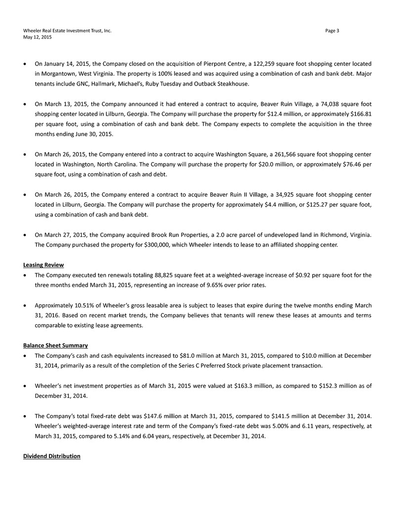 Wheeler Real Estate Investment Trust, Inc. Page 3 May 12, 2015 On January 14, 2015, the Company closed on the acquisition of Pierpont Centre, a 122,259 square foot shopping center located in Morgantown, West Virginia. The property is 100% leased and was acquired using a combination of cash and bank debt. Major tenants include GNC, Hallmark, Michael’s, Ruby Tuesday and Outback Steakhouse. On March 13, 2015, the Company announced it had entered a contract to acquire, Beaver Ruin Village, a 74,038 square foot shopping center located in Lilburn, Georgia. The Company will purchase the property for $12.4 million, or approximately $166.81 per square foot, using a combination of cash and bank debt. The Company expects to complete the acquisition in the three months ending June 30, 2015. On March 26, 2015, the Company entered into a contract to acquire Washington Square, a 261,566 square foot shopping center located in Washington, North Carolina. The Company will purchase the property for $20.0 million, or approximately $76.46 per square foot, using a combination of cash and debt. On March 26, 2015, the Company entered a contract to acquire Beaver Ruin II Village, a 34,925 square foot shopping center located in Lilburn, Georgia. The Company will purchase the property for approximately $4.4 million, or $125.27 per square foot, using a combination of cash and bank debt. On March 27, 2015, the Company acquired Brook Run Properties, a 2.0 acre parcel of undeveloped land in Richmond, Virginia. The Company purchased the property for $300,000, which Wheeler intends to lease to an affiliated shopping center. Leasing Review The Company executed ten renewals totaling 88,825 square feet at a weighted-average increase of $0.92 per square foot for the three months ended March 31, 2015, representing an increase of 9.65% over prior rates. Approximately 10.51% of Wheeler’s gross leasable area is subject to leases that expire during the twelve months ending March 31, 2016. Based on recent market trends, the Company believes that tenants will renew these leases at amounts and terms comparable to existing lease agreements. Balance Sheet Summary The Company’s cash and cash equivalents increased to $81.0 million at March 31, 2015, compared to $10.0 million at December 31, 2014, primarily as a result of the completion of the Series C Preferred Stock private placement transaction. Wheeler’s net investment properties as of March 31, 2015 were valued at $163.3 million, as compared to $152.3 million as of December 31, 2014. The Company’s total fixed-rate debt was $147.6 million at March 31, 2015, compared to $141.5 million at December 31, 2014. Wheeler’s weighted-average interest rate and term of the Company’s fixed-rate debt was 5.00% and 6.11 years, respectively, at March 31, 2015, compared to 5.14% and 6.04 years, respectively, at December 31, 2014. Dividend Distribution