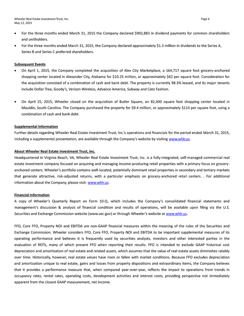 Wheeler Real Estate Investment Trust, Inc. Page 4 May 12, 2015 For the three months ended March 31, 2015 the Company declared $992,883 in dividend payments for common shareholders and unitholders. For the three months ended March 31, 2015, the Company declared approximately $1.3 million in dividends to the Series A, Series B and Series C preferred shareholders. Subsequent Events On April 1, 2015, the Company completed the acquisition of Alex City Marketplace, a 164,717 square foot grocery-anchored shopping center located in Alexander City, Alabama for $10.25 million, or approximately $62 per square foot. Consideration for the acquisition consisted of a combination of cash and bank debt. The property is currently 98.3% leased, and its major tenants include Dollar Tree, Goody’s, Verizon Wireless, Advance America, Subway and Cato Fashion. On April 15, 2015, Wheeler closed on the acquisition of Butler Square, an 82,400 square foot shopping center located in Mauldin, South Carolina. The Company purchased the property for $9.4 million, or approximately $114 per square foot, using a combination of cash and bank debt. Supplemental Information Further details regarding Wheeler Real Estate Investment Trust, Inc.’s operations and financials for the period ended March 31, 2015, including a supplemental presentation, are available through the Company’s website by visiting www.whlr.us. About Wheeler Real Estate Investment Trust, Inc. Headquartered in Virginia Beach, VA, Wheeler Real Estate Investment Trust, Inc. is a fully-integrated, self-managed commercial real estate investment company focused on acquiring and managing income-producing retail properties with a primary focus on grocery- anchored centers. Wheeler’s portfolio contains well-located, potentially dominant retail properties in secondary and tertiary markets that generate attractive, risk-adjusted returns, with a particular emphasis on grocery-anchored retail centers. . For additional information about the Company, please visit: www.whlr.us. Financial Information A copy of Wheeler’s Quarterly Report on Form 10-Q, which includes the Company’s consolidated financial statements and management’s discussion & analysis of financial condition and results of operations, will be available upon filing via the U.S. Securities and Exchange Commission website (www.sec.gov) or through Wheeler’s website at www.whlr.us. FFO, Core FFO, Property NOI and EBITDA are non-GAAP financial measures within the meaning of the rules of the Securities and Exchange Commission. Wheeler considers FFO, Core FFO, Property NOI and EBITDA to be important supplemental measures of its operating performance and believes it is frequently used by securities analysts, investors and other interested parties in the evaluation of REITs, many of which present FFO when reporting their results. FFO is intended to exclude GAAP historical cost depreciation and amortization of real estate and related assets, which assumes that the value of real estate assets diminishes ratably over time. Historically, however, real estate values have risen or fallen with market conditions. Because FFO excludes depreciation and amortization unique to real estate, gains and losses from property dispositions and extraordinary items, the Company believes that it provides a performance measure that, when compared year-over-year, reflects the impact to operations from trends in occupancy rates, rental rates, operating costs, development activities and interest costs, providing perspective not immediately apparent from the closest GAAP measurement, net income.