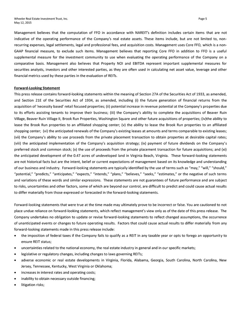 Wheeler Real Estate Investment Trust, Inc. Page 5 May 12, 2015 Management believes that the computation of FFO in accordance with NAREIT’s definition includes certain items that are not indicative of the operating performance of the Company’s real estate assets. These items include, but are not limited to, non- recurring expenses, legal settlements, legal and professional fees, and acquisition costs. Management uses Core FFO, which is a non- GAAP financial measure, to exclude such items. Management believes that reporting Core FFO in addition to FFO is a useful supplemental measure for the investment community to use when evaluating the operating performance of the Company on a comparative basis. Management also believes that Property NOI and EBITDA represent important supplemental measures for securities analysts, investors and other interested parties, as they are often used in calculating net asset value, leverage and other financial metrics used by these parties in the evaluation of REITs. Forward-Looking Statement This press release contains forward-looking statements within the meaning of Section 27A of the Securities Act of 1933, as amended, and Section 21E of the Securities Act of 1934, as amended, including (i) the future generation of financial returns from the acquisition of ‘necessity based’ retail focused properties; (ii) potential increase in revenue potential at the Company’s properties due to its efforts assisting tenants to improve their business; (iii) the Company’s ability to complete the acquisitions of Beaver Ruin Village, Beaver Ruin Village II, Brook Run Properties, Washington Square and other future acquisitions of properties; (iv)the ability to lease the Brook Run properties to an affiliated shopping center; (v) the ability to lease the Brook Run properties to an affiliated shopping center; (vi) the anticipated renewals of the Company’s existing leases at amounts and terms comparable to existing leases; (vii) the Company’s ability to use proceeds from the private placement transaction to obtain properties at desirable capital rates; (viii) the anticipated implementation of the Company’s acquisition strategy; (ix) payment of future dividends on the Company’s preferred stock and common stock; (x) the use of proceeds from the private placement transaction for future acquisitions; and (xi) the anticipated development of the 0.47 acres of undeveloped land in Virginia Beach, Virginia. These forward-looking statements are not historical facts but are the intent, belief or current expectations of management based on its knowledge and understanding of our business and industry. Forward-looking statements are typically identified by the use of terms such as “may,” “will,” “should,” “potential,” “predicts,” “anticipates,” “expects,” “intends,” “plans,” “believes,” “seeks,” “estimates,” or the negative of such terms and variations of these words and similar expressions. These statements are not guarantees of future performance and are subject to risks, uncertainties and other factors, some of which are beyond our control, are difficult to predict and could cause actual results to differ materially from those expressed or forecasted in the forward-looking statements. Forward-looking statements that were true at the time made may ultimately prove to be incorrect or false. You are cautioned to not place undue reliance on forward-looking statements, which reflect management’s view only as of the date of this press release. The Company undertakes no obligation to update or revise forward-looking statements to reflect changed assumptions, the occurrence of unanticipated events or changes to future operating results. Factors that could cause actual results to differ materially from any forward-looking statements made in this press release include: the imposition of federal taxes if the Company fails to qualify as a REIT in any taxable year or opts to forego an opportunity to ensure REIT status; uncertainties related to the national economy, the real estate industry in general and in our specific markets; legislative or regulatory changes, including changes to laws governing REITs; adverse economic or real estate developments in Virginia, Florida, Alabama, Georgia, South Carolina, North Carolina, New Jersey, Tennessee, Kentucky, West Virginia or Oklahoma; increases in interest rates and operating costs; inability to obtain necessary outside financing; litigation risks;