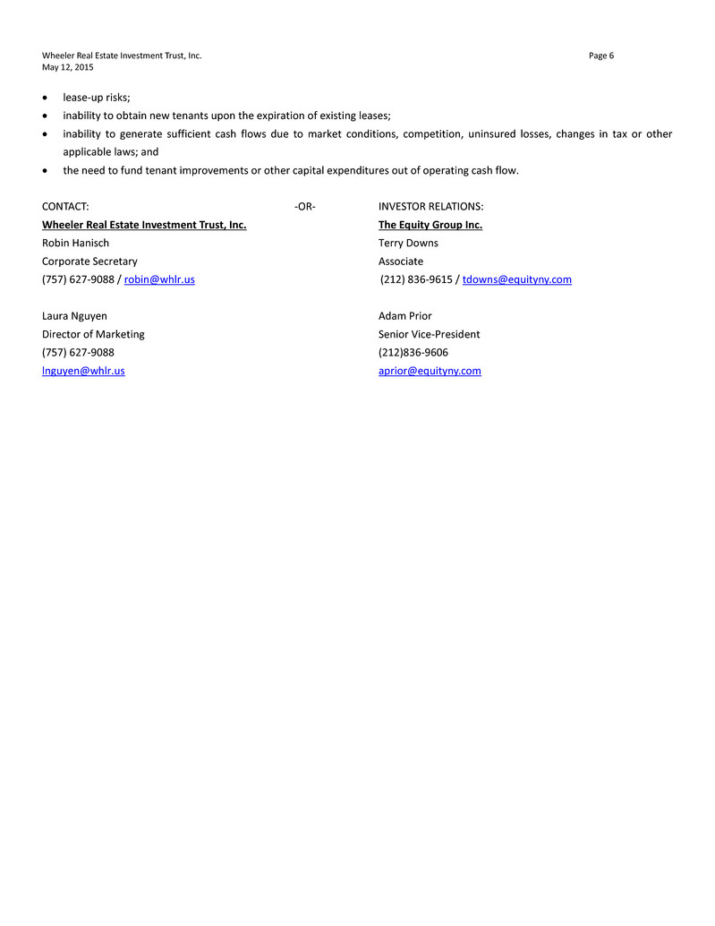Wheeler Real Estate Investment Trust, Inc. Page 6 May 12, 2015 lease-up risks; inability to obtain new tenants upon the expiration of existing leases; inability to generate sufficient cash flows due to market conditions, competition, uninsured losses, changes in tax or other applicable laws; and the need to fund tenant improvements or other capital expenditures out of operating cash flow. CONTACT: -OR- INVESTOR RELATIONS: Wheeler Real Estate Investment Trust, Inc. The Equity Group Inc. Robin Hanisch Terry Downs Corporate Secretary Associate (757) 627-9088 / robin@whlr.us (212) 836-9615 / tdowns@equityny.com Laura Nguyen Adam Prior Director of Marketing Senior Vice-President (757) 627-9088 (212)836-9606 lnguyen@whlr.us aprior@equityny.com