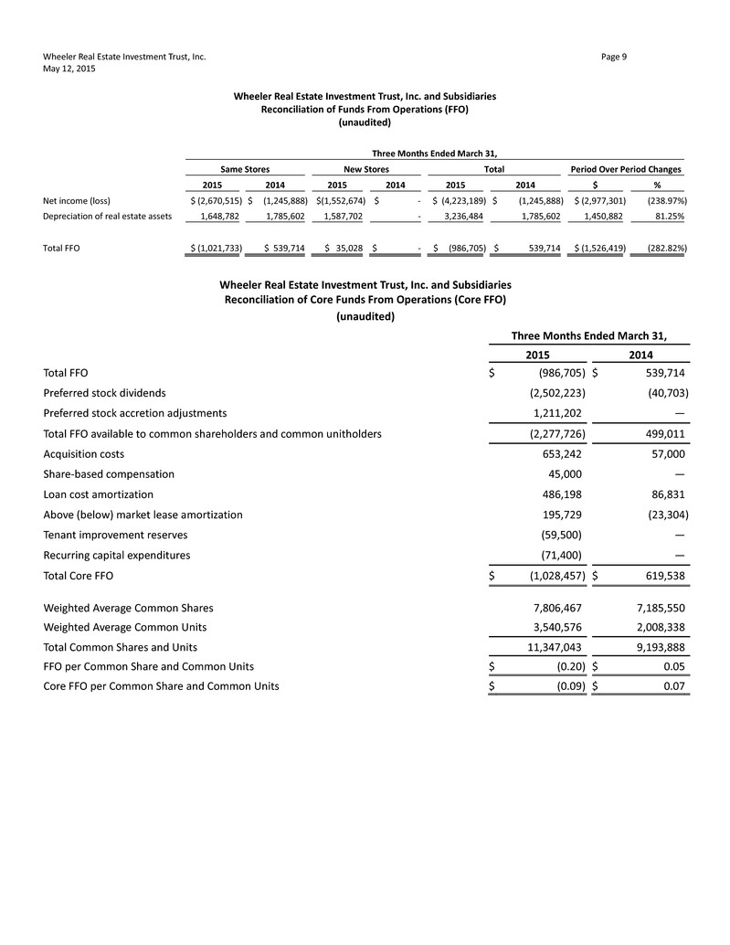 Wheeler Real Estate Investment Trust, Inc. Page 9 May 12, 2015 Wheeler Real Estate Investment Trust, Inc. and Subsidiaries Reconciliation of Funds From Operations (FFO) (unaudited) Three Months Ended March 31, Same Stores New Stores Total Period Over Period Changes 2015 2014 2015 2014 2015 2014 $ % Net income (loss) $ (2,670,515 ) $ (1,245,888 ) $(1,552,674 ) $ - $ (4,223,189 ) $ (1,245,888 ) $ (2,977,301 ) (238.97% ) Depreciation of real estate assets 1,648,782 1,785,602 1,587,702 - 3,236,484 1,785,602 1,450,882 81.25% Total FFO $ (1,021,733 ) $ 539,714 $ 35,028 $ - $ (986,705 ) $ 539,714 $ (1,526,419 ) (282.82% ) Wheeler Real Estate Investment Trust, Inc. and Subsidiaries Reconciliation of Core Funds From Operations (Core FFO) (unaudited) Three Months Ended March 31, 2015 2014 Total FFO $ (986,705 ) $ 539,714 Preferred stock dividends (2,502,223 ) (40,703 ) Preferred stock accretion adjustments 1,211,202 — Total FFO available to common shareholders and common unitholders (2,277,726 ) 499,011 Acquisition costs 653,242 57,000 Share-based compensation 45,000 — Loan cost amortization 486,198 86,831 Above (below) market lease amortization 195,729 (23,304 ) Tenant improvement reserves (59,500) — Recurring capital expenditures (71,400) — Total Core FFO $ (1,028,457 ) $ 619,538 Weighted Average Common Shares 7,806,467 7,185,550 Weighted Average Common Units 3,540,576 2,008,338 Total Common Shares and Units 11,347,043 9,193,888 FFO per Common Share and Common Units $ (0.20 ) $ 0.05 Core FFO per Common Share and Common Units $ (0.09 ) $ 0.07