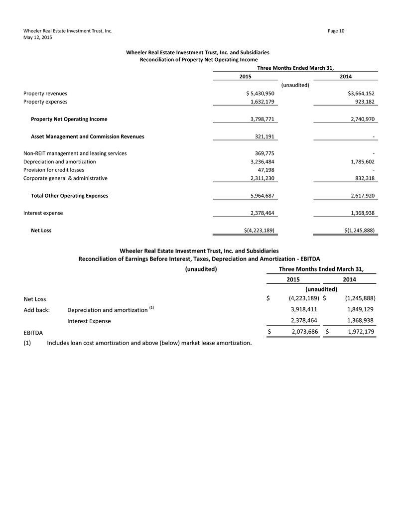 Wheeler Real Estate Investment Trust, Inc. Page 10 May 12, 2015 Wheeler Real Estate Investment Trust, Inc. and Subsidiaries Reconciliation of Property Net Operating Income Three Months Ended March 31, 2015 2014 (unaudited) Property revenues $ 5,430,950 $3,664,152 Property expenses 1,632,179 923,182 Property Net Operating Income 3,798,771 2,740,970 Asset Management and Commission Revenues 321,191 - Non-REIT management and leasing services 369,775 - Depreciation and amortization 3,236,484 1,785,602 Provision for credit losses 47,198 - Corporate general & administrative 2,311,230 832,318 Total Other Operating Expenses 5,964,687 2,617,920 Interest expense 2,378,464 1,368,938 Net Loss $(4,223,189) $(1,245,888) Wheeler Real Estate Investment Trust, Inc. and Subsidiaries Reconciliation of Earnings Before Interest, Taxes, Depreciation and Amortization - EBITDA ( (unaudited) Three Months Ended March 31, 2015 2014 (unaudited) Net Loss $ (4,223,189 ) $ (1,245,888 ) Add back: Depreciation and amortization (1) 3,918,411 1,849,129 Interest Expense 2,378,464 1,368,938 EBITDA $ 2,073,686 $ 1,972,179 (1) Includes loan cost amortization and above (below) market lease amortization.