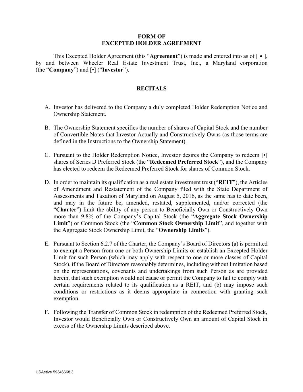 USActive 59346668.3 FORM OF EXCEPTED HOLDER AGREEMENT This Excepted Holder Agreement (this “Agreement”) is made and entered into as of [], by and between Wheeler Real Estate Investment Trust, Inc., a Maryland corporation (the “Company”) and [•] (“Investor”). RECITALS A. Investor has delivered to the Company a duly completed Holder Redemption Notice and Ownership Statement. B. The Ownership Statement specifies the number of shares of Capital Stock and the number of Convertible Notes that Investor Actually and Constructively Owns (as those terms are defined in the Instructions to the Ownership Statement). C. Pursuant to the Holder Redemption Notice, Investor desires the Company to redeem [•] shares of Series D Preferred Stock (the “Redeemed Preferred Stock”), and the Company has elected to redeem the Redeemed Preferred Stock for shares of Common Stock. D. In order to maintain its qualification as a real estate investment trust (“REIT”), the Articles of Amendment and Restatement of the Company filed with the State Department of Assessments and Taxation of Maryland on August 5, 2016, as the same has to date been, and may in the future be, amended, restated, supplemented, and/or corrected (the “Charter”) limit the ability of any person to Beneficially Own or Constructively Own more than 9.8% of the Company’s Capital Stock (the “Aggregate Stock Ownership Limit”) or Common Stock (the “Common Stock Ownership Limit”, and together with the Aggregate Stock Ownership Limit, the “Ownership Limits”). E. Pursuant to Section 6.2.7 of the Charter, the Company’s Board of Directors (a) is permitted to exempt a Person from one or both Ownership Limits or establish an Excepted Holder Limit for such Person (which may apply with respect to one or more classes of Capital Stock), if the Board of Directors reasonably determines, including without limitation based on the representations, covenants and undertakings from such Person as are provided herein, that such exemption would not cause or permit the Company to fail to comply with certain requirements related to its qualification as a REIT, and (b) may impose such conditions or restrictions as it deems appropriate in connection with granting such exemption. F. Following the Transfer of Common Stock in redemption of the Redeemed Preferred Stock, Investor would Beneficially Own or Constructively Own an amount of Capital Stock in excess of the Ownership Limits described above.