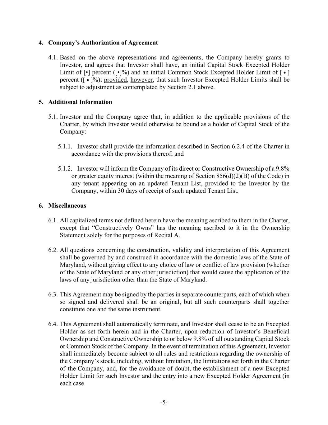 -5- 4. Company’s Authorization of Agreement 4.1. Based on the above representations and agreements, the Company hereby grants to Investor, and agrees that Investor shall have, an initial Capital Stock Excepted Holder Limit of [•] percent ([•]%) and an initial Common Stock Excepted Holder Limit of [] percent ([]%); provided, however, that such Investor Excepted Holder Limits shall be subject to adjustment as contemplated by Section 2.1 above. 5. Additional Information 5.1. Investor and the Company agree that, in addition to the applicable provisions of the Charter, by which Investor would otherwise be bound as a holder of Capital Stock of the Company: 5.1.1. Investor shall provide the information described in Section 6.2.4 of the Charter in accordance with the provisions thereof; and 5.1.2. Investor will inform the Company of its direct or Constructive Ownership of a 9.8% or greater equity interest (within the meaning of Section 856(d)(2)(B) of the Code) in any tenant appearing on an updated Tenant List, provided to the Investor by the Company, within 30 days of receipt of such updated Tenant List. 6. Miscellaneous 6.1. All capitalized terms not defined herein have the meaning ascribed to them in the Charter, except that “Constructively Owns” has the meaning ascribed to it in the Ownership Statement solely for the purposes of Recital A. 6.2. All questions concerning the construction, validity and interpretation of this Agreement shall be governed by and construed in accordance with the domestic laws of the State of Maryland, without giving effect to any choice of law or conflict of law provision (whether of the State of Maryland or any other jurisdiction) that would cause the application of the laws of any jurisdiction other than the State of Maryland. 6.3. This Agreement may be signed by the parties in separate counterparts, each of which when so signed and delivered shall be an original, but all such counterparts shall together constitute one and the same instrument. 6.4. This Agreement shall automatically terminate, and Investor shall cease to be an Excepted Holder as set forth herein and in the Charter, upon reduction of Investor’s Beneficial Ownership and Constructive Ownership to or below 9.8% of all outstanding Capital Stock or Common Stock of the Company. In the event of termination of this Agreement, Investor shall immediately become subject to all rules and restrictions regarding the ownership of the Company’s stock, including, without limitation, the limitations set forth in the Charter of the Company, and, for the avoidance of doubt, the establishment of a new Excepted Holder Limit for such Investor and the entry into a new Excepted Holder Agreement (in each case