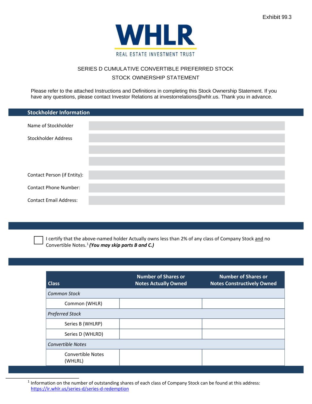 Exhibit 99.3 SERIES D CUMULATIVE CONVERTIBLE PREFERRED STOCK STOCK OWNERSHIP STATEMENT Please refer to the attached Instructions and Definitions in completing this Stock Ownership Statement. If you have any questions, please contact Investor Relations at investorrelations@whlr.us. Thank you in advance. Stockholder Information Name of Stockholder Stockholder Address Contact Person (if Entity): Contact Phone Number: Contact Email Address: I certify that the above‐named holder Actually owns less than 2% of any class of Company Stock and no Convertible Notes.1 (You may skip parts B and C.) Number of Shares or Class Notes Actually Owned Number of Shares or Notes Constructively Owned Common Stock Common (WHLR) Preferred Stock Series B (WHLRP) Series D (WHLRD) Convertible Notes Convertible Notes (WHLRL) 1 Information on the number of outstanding shares of each class of Company Stock can be found at this address: https://ir.whlr.us/series‐d/series‐d‐redemption