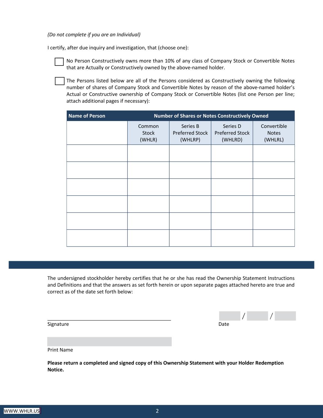 2 WWW.WHLR.US (Do not complete if you are an Individual) I certify, after due inquiry and investigation, that (choose one): No Person Constructively owns more than 10% of any class of Company Stock or Convertible Notes that are Actually or Constructively owned by the above‐named holder. The Persons listed below are all of the Persons considered as Constructively owning the following number of shares of Company Stock and Convertible Notes by reason of the above‐named holder’s Actual or Constructive ownership of Company Stock or Convertible Notes (list one Person per line; attach additional pages if necessary): Name of Person Number of Shares or Notes Constructively Owned Common Stock (WHLR) Series B Preferred Stock (WHLRP) Series D Preferred Stock (WHLRD) Convertible Notes (WHLRL) The undersigned stockholder hereby certifies that he or she has read the Ownership Statement Instructions and Definitions and that the answers as set forth herein or upon separate pages attached hereto are true and correct as of the date set forth below: Signature Date Print Name Please return a completed and signed copy of this Ownership Statement with your Holder Redemption Notice.