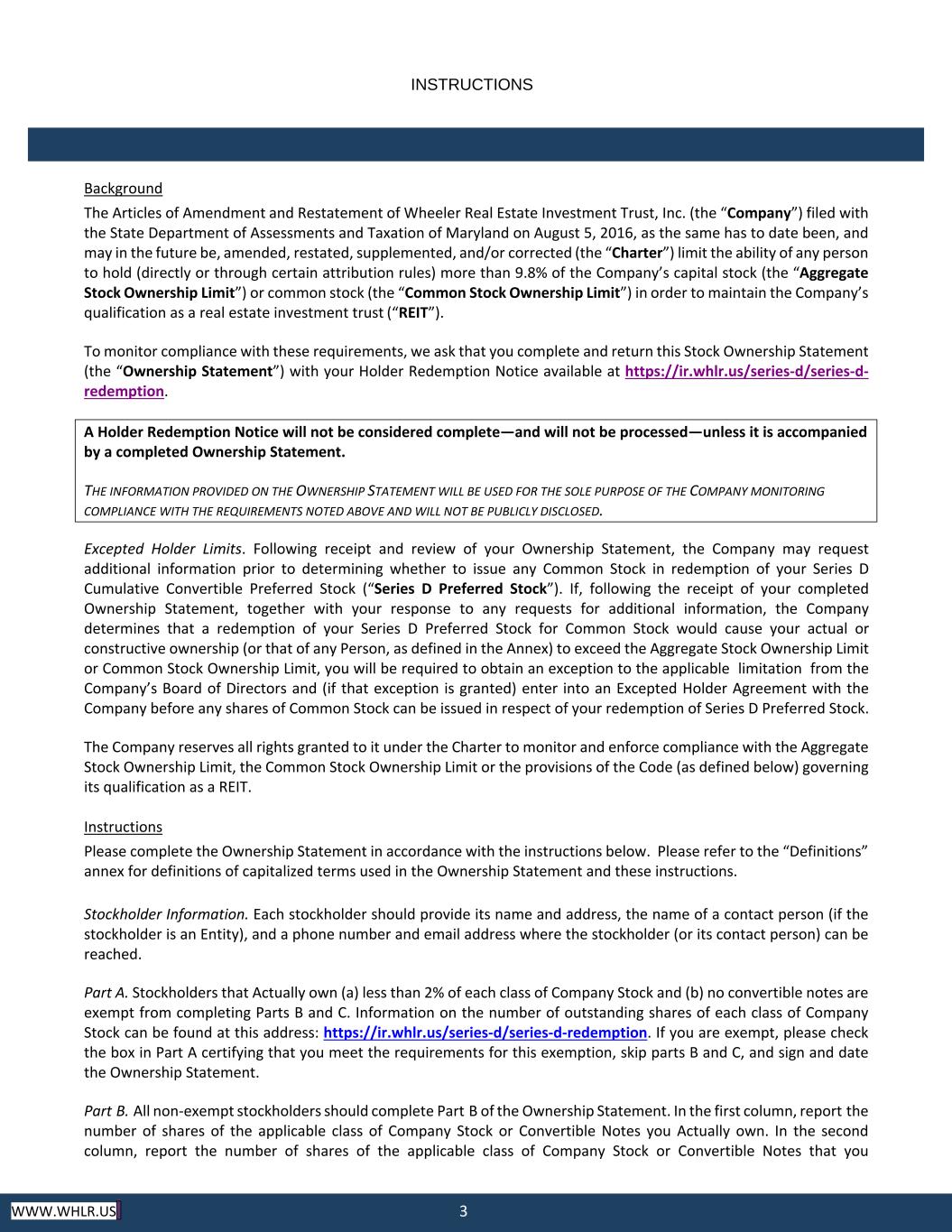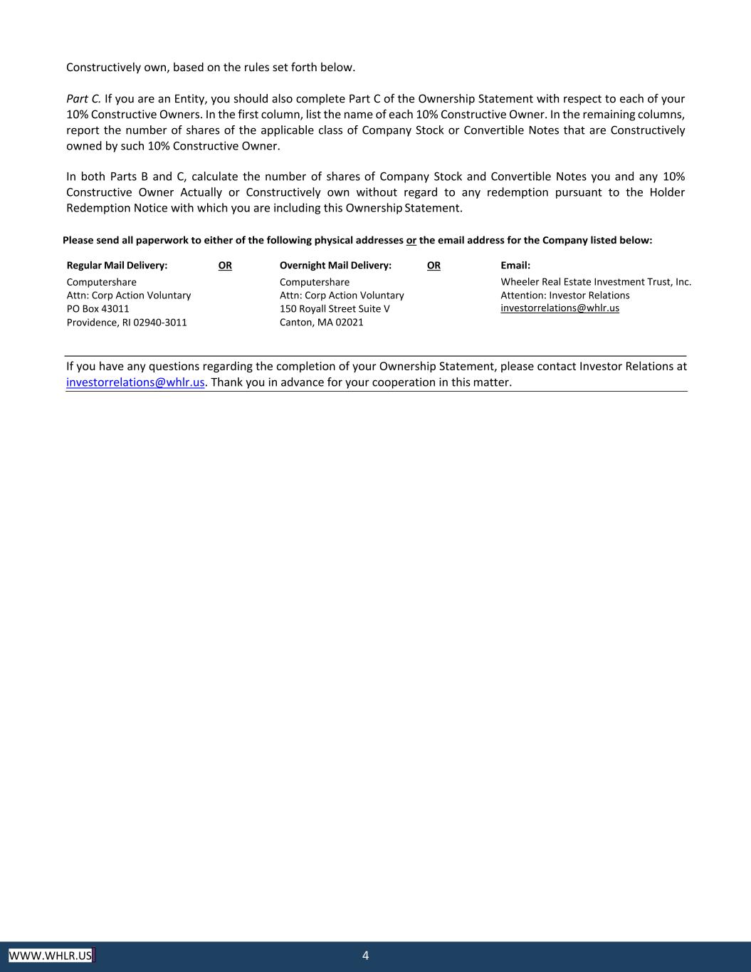 3 WWW.WHLR.US INSTRUCTIONS Background The Articles of Amendment and Restatement of Wheeler Real Estate Investment Trust, Inc. (the “Company”) filed with the State Department of Assessments and Taxation of Maryland on August 5, 2016, as the same has to date been, and may in the future be, amended, restated, supplemented, and/or corrected (the “Charter”) limit the ability of any person to hold (directly or through certain attribution rules) more than 9.8% of the Company’s capital stock (the “Aggregate Stock Ownership Limit”) or common stock (the “Common Stock Ownership Limit”) in order to maintain the Company’s qualification as a real estate investment trust (“REIT”). To monitor compliance with these requirements, we ask that you complete and return this Stock Ownership Statement (the “Ownership Statement”) with your Holder Redemption Notice available at https://ir.whlr.us/series-d/series-d- redemption. Excepted Holder Limits. Following receipt and review of your Ownership Statement, the Company may request additional information prior to determining whether to issue any Common Stock in redemption of your Series D Cumulative Convertible Preferred Stock (“Series D Preferred Stock”). If, following the receipt of your completed Ownership Statement, together with your response to any requests for additional information, the Company determines that a redemption of your Series D Preferred Stock for Common Stock would cause your actual or constructive ownership (or that of any Person, as defined in the Annex) to exceed the Aggregate Stock Ownership Limit or Common Stock Ownership Limit, you will be required to obtain an exception to the applicable limitation from the Company’s Board of Directors and (if that exception is granted) enter into an Excepted Holder Agreement with the Company before any shares of Common Stock can be issued in respect of your redemption of Series D Preferred Stock. The Company reserves all rights granted to it under the Charter to monitor and enforce compliance with the Aggregate Stock Ownership Limit, the Common Stock Ownership Limit or the provisions of the Code (as defined below) governing its qualification as a REIT. Instructions Please complete the Ownership Statement in accordance with the instructions below. Please refer to the “Definitions” annex for definitions of capitalized terms used in the Ownership Statement and these instructions. Stockholder Information. Each stockholder should provide its name and address, the name of a contact person (if the stockholder is an Entity), and a phone number and email address where the stockholder (or its contact person) can be reached. Part A. Stockholders that Actually own (a) less than 2% of each class of Company Stock and (b) no convertible notes are exempt from completing Parts B and C. Information on the number of outstanding shares of each class of Company Stock can be found at this address: https://ir.whlr.us/series-d/series-d-redemption. If you are exempt, please check the box in Part A certifying that you meet the requirements for this exemption, skip parts B and C, and sign and date the Ownership Statement. Part B. All non‐exempt stockholders should complete Part B of the Ownership Statement. In the first column, report the number of shares of the applicable class of Company Stock or Convertible Notes you Actually own. In the second column, report the number of shares of the applicable class of Company Stock or Convertible Notes that you A Holder Redemption Notice will not be considered complete—and will not be processed—unless it is accompanied by a completed Ownership Statement. THE INFORMATION PROVIDED ON THE OWNERSHIP STATEMENT WILL BE USED FOR THE SOLE PURPOSE OF THE COMPANY MONITORING COMPLIANCE WITH THE REQUIREMENTS NOTED ABOVE AND WILL NOT BE PUBLICLY DISCLOSED.