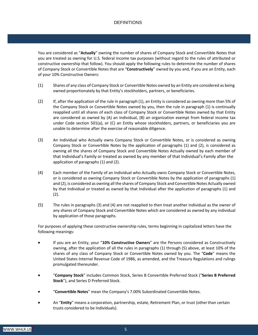 5 WWW.WHLR.US DEFINITIONS You are considered as “Actually” owning the number of shares of Company Stock and Convertible Notes that you are treated as owning for U.S. federal income tax purposes (without regard to the rules of attributed or constructive ownership that follow). You should apply the following rules to determine the number of shares of Company Stock or Convertible Notes that are “Constructively” owned by you and, if you are an Entity, each of your 10% Constructive Owners: (1) Shares of any class of Company Stock or Convertible Notes owned by an Entity are considered as being owned proportionately by that Entity’s stockholders, partners, or beneficiaries. (2) If, after the application of the rule in paragraph (1), an Entity is considered as owning more than 5% of the Company Stock or Convertible Notes owned by you, then the rule in paragraph (1) is continually reapplied until all shares of each class of Company Stock or Convertible Notes owned by that Entity are considered as owned by (A) an Individual, (B) an organization exempt from federal income tax under Code section 501(a), or (C) an Entity whose stockholders, partners, or beneficiaries you are unable to determine after the exercise of reasonable diligence. (3) An Individual who Actually owns Company Stock or Convertible Notes, or is considered as owning Company Stock or Convertible Notes by the application of paragraphs (1) and (2), is considered as owning all the shares of Company Stock and Convertible Notes Actually owned by each member of that Individual’s Family or treated as owned by any member of that Individual’s Family after the application of paragraphs (1) and (2). (4) Each member of the Family of an Individual who Actually owns Company Stock or Convertible Notes, or is considered as owning Company Stock or Convertible Notes by the application of paragraphs (1) and (2), is considered as owning all the shares of Company Stock and Convertible Notes Actually owned by that Individual or treated as owned by that Individual after the application of paragraphs (1) and (2). (5) The rules in paragraphs (3) and (4) are not reapplied to then treat another individual as the owner of any shares of Company Stock and Convertible Notes which are considered as owned by any individual by application of those paragraphs. For purposes of applying these constructive ownership rules, terms beginning in capitalized letters have the following meanings: • If you are an Entity, your “10% Constructive Owners” are the Persons considered as Constructively owning, after the application of all the rules in paragraphs (1) through (5) above, at least 10% of the shares of any class of Company Stock or Convertible Notes owned by you. The “Code” means the United States Internal Revenue Code of 1986, as amended, and the Treasury Regulations and rulings promulgated thereunder. • “Company Stock” includes Common Stock, Series B Convertible Preferred Stock (“Series B Preferred Stock”), and Series D Preferred Stock. • “Convertible Notes” mean the Company’s 7.00% Subordinated Convertible Notes. • An “Entity” means a corporation, partnership, estate, Retirement Plan, or trust (other than certain trusts considered to be Individuals).