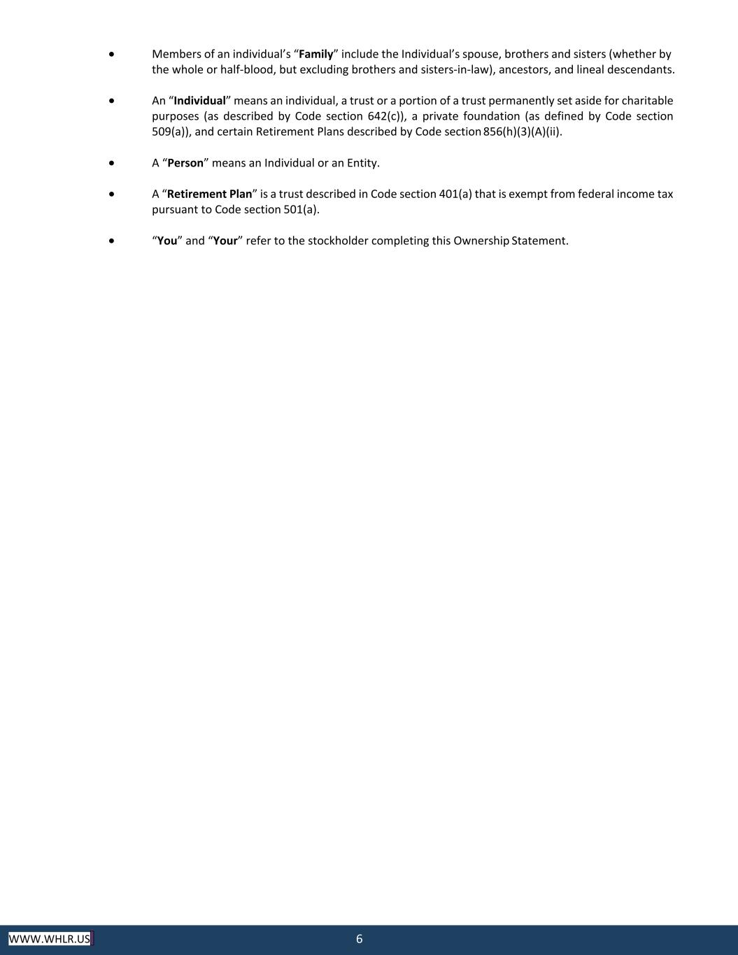 6 WWW.WHLR.US • Members of an individual’s “Family” include the Individual’s spouse, brothers and sisters (whether by the whole or half‐blood, but excluding brothers and sisters‐in‐law), ancestors, and lineal descendants. • An “Individual” means an individual, a trust or a portion of a trust permanently set aside for charitable purposes (as described by Code section 642(c)), a private foundation (as defined by Code section 509(a)), and certain Retirement Plans described by Code section 856(h)(3)(A)(ii). • A “Person” means an Individual or an Entity. • A “Retirement Plan” is a trust described in Code section 401(a) that is exempt from federal income tax pursuant to Code section 501(a). • “You” and “Your” refer to the stockholder completing this Ownership Statement.