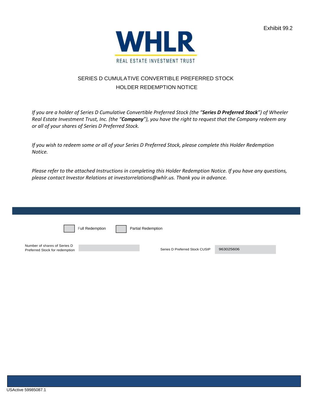 Exhibit 99.2 USActive 59985087.1 SERIES D CUMULATIVE CONVERTIBLE PREFERRED STOCK HOLDER REDEMPTION NOTICE If you are a holder of Series D Cumulative Convertible Preferred Stock (the “Series D Preferred Stock”) of Wheeler Real Estate Investment Trust, Inc. (the “Company”), you have the right to request that the Company redeem any or all of your shares of Series D Preferred Stock. If you wish to redeem some or all of your Series D Preferred Stock, please complete this Holder Redemption Notice. Please refer to the attached Instructions in completing this Holder Redemption Notice. If you have any questions, please contact Investor Relations at investorrelations@whlr.us. Thank you in advance. Full Redemption Partial Redemption Number of shares of Series D Preferred Stock for redemption Series D Preferred Stock CUSIP 963025606