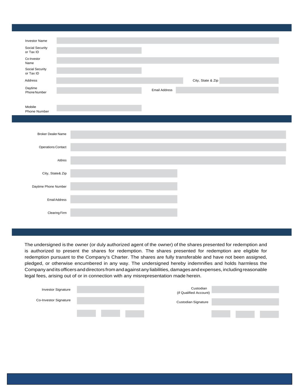 Investor Name Social Security or Tax ID Co-Investor Name Social Security or Tax ID Address Daytime Phone Number Email Address City, State & Zip Mobile Phone Number Broker Dealer Name Operations Contact Address City, State& Zip Daytime Phone Number Email Address Clearing Firm The undersigned is the owner (or duly authorized agent of the owner) of the shares presented for redemption and is authorized to present the shares for redemption. The shares presented for redemption are eligible for redemption pursuant to the Company's Charter. The shares are fully transferable and have not been assigned, pledged, or otherwise encumbered in any way. The undersigned hereby indemnifies and holds harmless the Company and its officers and directors from and against any liabilities, damages and expenses, including reasonable legal fees, arising out of or in connection with any misrepresentation made herein. Investor Signature Co-Investor Signature Custodian (if Qualified Account) Custodian Signature