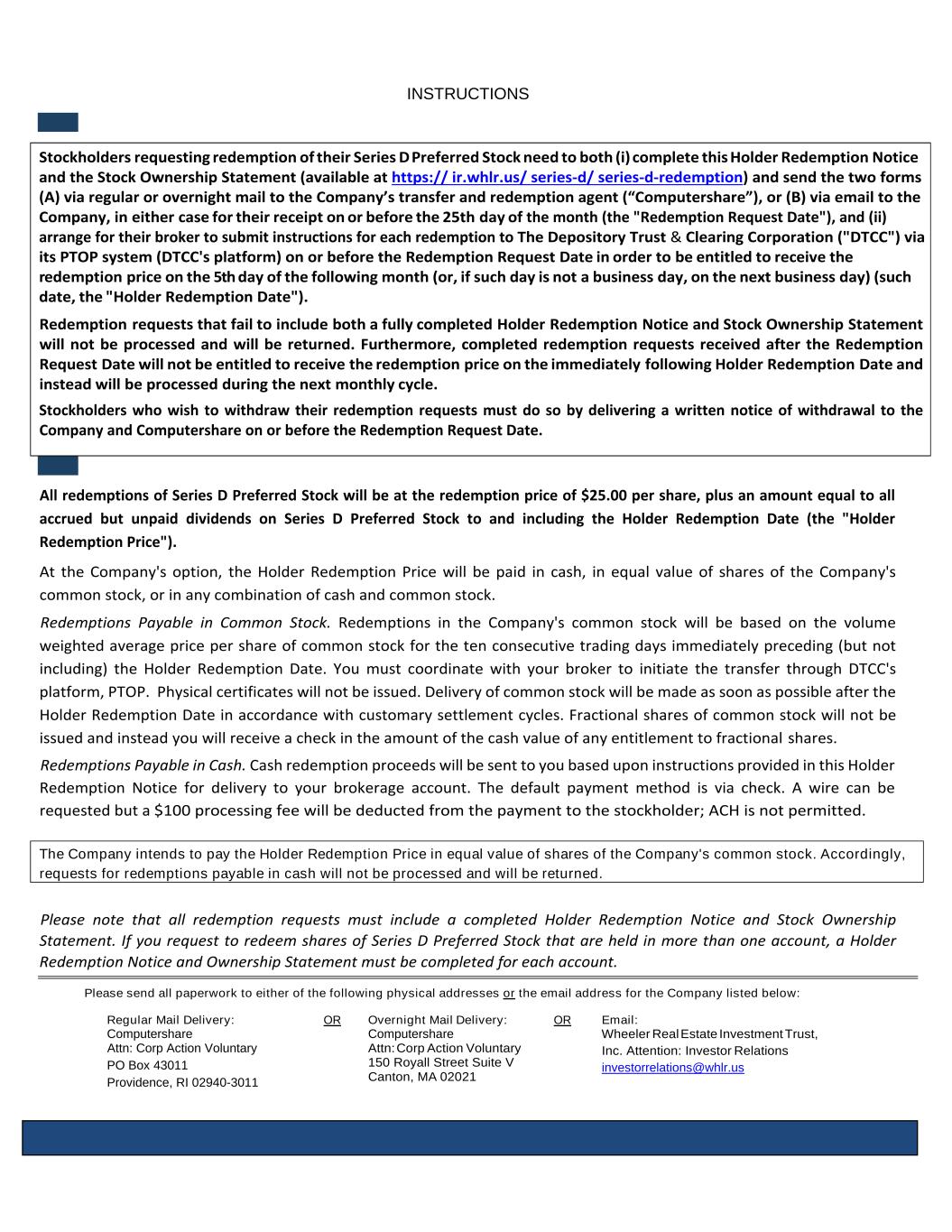 INSTRUCTIONS All redemptions of Series D Preferred Stock will be at the redemption price of $25.00 per share, plus an amount equal to all accrued but unpaid dividends on Series D Preferred Stock to and including the Holder Redemption Date (the "Holder Redemption Price"). At the Company's option, the Holder Redemption Price will be paid in cash, in equal value of shares of the Company's common stock, or in any combination of cash and common stock. Redemptions Payable in Common Stock. Redemptions in the Company's common stock will be based on the volume weighted average price per share of common stock for the ten consecutive trading days immediately preceding (but not including) the Holder Redemption Date. You must coordinate with your broker to initiate the transfer through DTCC's platform, PTOP. Physical certificates will not be issued. Delivery of common stock will be made as soon as possible after the Holder Redemption Date in accordance with customary settlement cycles. Fractional shares of common stock will not be issued and instead you will receive a check in the amount of the cash value of any entitlement to fractional shares. Redemptions Payable in Cash. Cash redemption proceeds will be sent to you based upon instructions provided in this Holder Redemption Notice for delivery to your brokerage account. The default payment method is via check. A wire can be requested but a $100 processing fee will be deducted from the payment to the stockholder; ACH is not permitted. Please note that all redemption requests must include a completed Holder Redemption Notice and Stock Ownership Statement. If you request to redeem shares of Series D Preferred Stock that are held in more than one account, a Holder Redemption Notice and Ownership Statement must be completed for each account. Please send all paperwork to either of the following physical addresses or the email address for the Company listed below: Regular Mail Delivery: Computershare Attn: Corp Action Voluntary PO Box 43011 Providence, RI 02940-3011 OR Overnight Mail Delivery: Computershare Attn: Corp Action Voluntary 150 Royall Street Suite V Canton, MA 02021 OR Email: Wheeler Real Estate Investment Trust, Inc. Attention: Investor Relations investorrelations@whlr.us the month (the "Redemption Request Date"), and (ii) arrange for their broker to submit instructions for each redemption to Stockholders who wish to withdraw their redemption requests must do so by delivering a written notice of withdrawal to the Company and Computershare on or before the Redemption Request Date. The Company intends to pay the Holder Redemption Price in equal value of shares of the Company's common stock. Accordingly, requests for redemptions payable in cash will not be processed and will be returned.