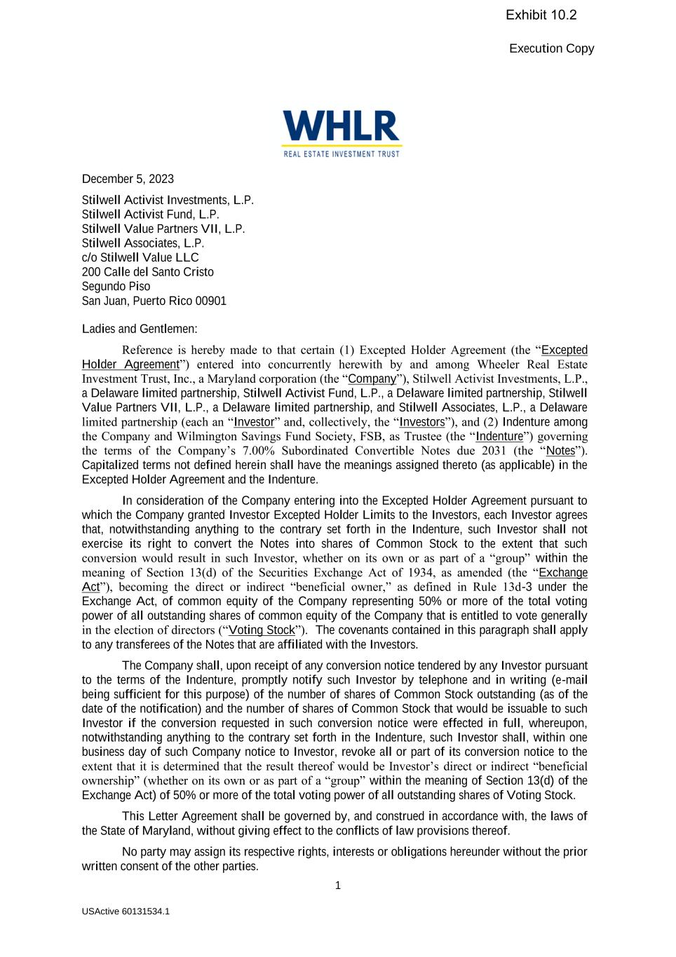 Execution Copy 1 USActive 60131534.1 December 5, 2023 Stilwell Activist Investments, L.P. Stilwell Activist Fund, L.P. Stilwell Value Partners VII, L.P. Stilwell Associates, L.P. c/o Stilwell Value LLC 200 Calle del Santo Cristo Segundo Piso San Juan, Puerto Rico 00901 Ladies and Gentlemen: Reference is hereby made to that certain (1) Excepted Holder Agreement (the “Excepted Holder Agreement”) entered into concurrently herewith by and among Wheeler Real Estate Investment Trust, Inc., a Maryland corporation (the “Company”), Stilwell Activist Investments, L.P., a Delaware limited partnership, Stilwell Activist Fund, L.P., a Delaware limited partnership, Stilwell Value Partners VII, L.P., a Delaware limited partnership, and Stilwell Associates, L.P., a Delaware limited partnership (each an “Investor” and, collectively, the “Investors”), and (2) Indenture among the Company and Wilmington Savings Fund Society, FSB, as Trustee (the “Indenture”) governing the terms of the Company’s 7.00% Subordinated Convertible Notes due 2031 (the “Notes”). Capitalized terms not defined herein shall have the meanings assigned thereto (as applicable) in the Excepted Holder Agreement and the Indenture. In consideration of the Company entering into the Excepted Holder Agreement pursuant to which the Company granted Investor Excepted Holder Limits to the Investors, each Investor agrees that, notwithstanding anything to the contrary set forth in the Indenture, such Investor shall not exercise its right to convert the Notes into shares of Common Stock to the extent that such conversion would result in such Investor, whether on its own or as part of a “group” within the meaning of Section 13(d) of the Securities Exchange Act of 1934, as amended (the “Exchange Act”), becoming the direct or indirect “beneficial owner,” as defined in Rule 13d-3 under the Exchange Act, of common equity of the Company representing 50% or more of the total voting power of all outstanding shares of common equity of the Company that is entitled to vote generally in the election of directors (“Voting Stock”). The covenants contained in this paragraph shall apply to any transferees of the Notes that are affiliated with the Investors. The Company shall, upon receipt of any conversion notice tendered by any Investor pursuant to the terms of the Indenture, promptly notify such Investor by telephone and in writing (e-mail being sufficient for this purpose) of the number of shares of Common Stock outstanding (as of the date of the notification) and the number of shares of Common Stock that would be issuable to such Investor if the conversion requested in such conversion notice were effected in full, whereupon, notwithstanding anything to the contrary set forth in the Indenture, such Investor shall, within one business day of such Company notice to Investor, revoke all or part of its conversion notice to the extent that it is determined that the result thereof would be Investor’s direct or indirect “beneficial ownership” (whether on its own or as part of a “group” within the meaning of Section 13(d) of the Exchange Act) of 50% or more of the total voting power of all outstanding shares of Voting Stock. This Letter Agreement shall be governed by, and construed in accordance with, the laws of the State of Maryland, without giving effect to the conflicts of law provisions thereof. No party may assign its respective rights, interests or obligations hereunder without the prior written consent of the other parties. Exhibit 10.2