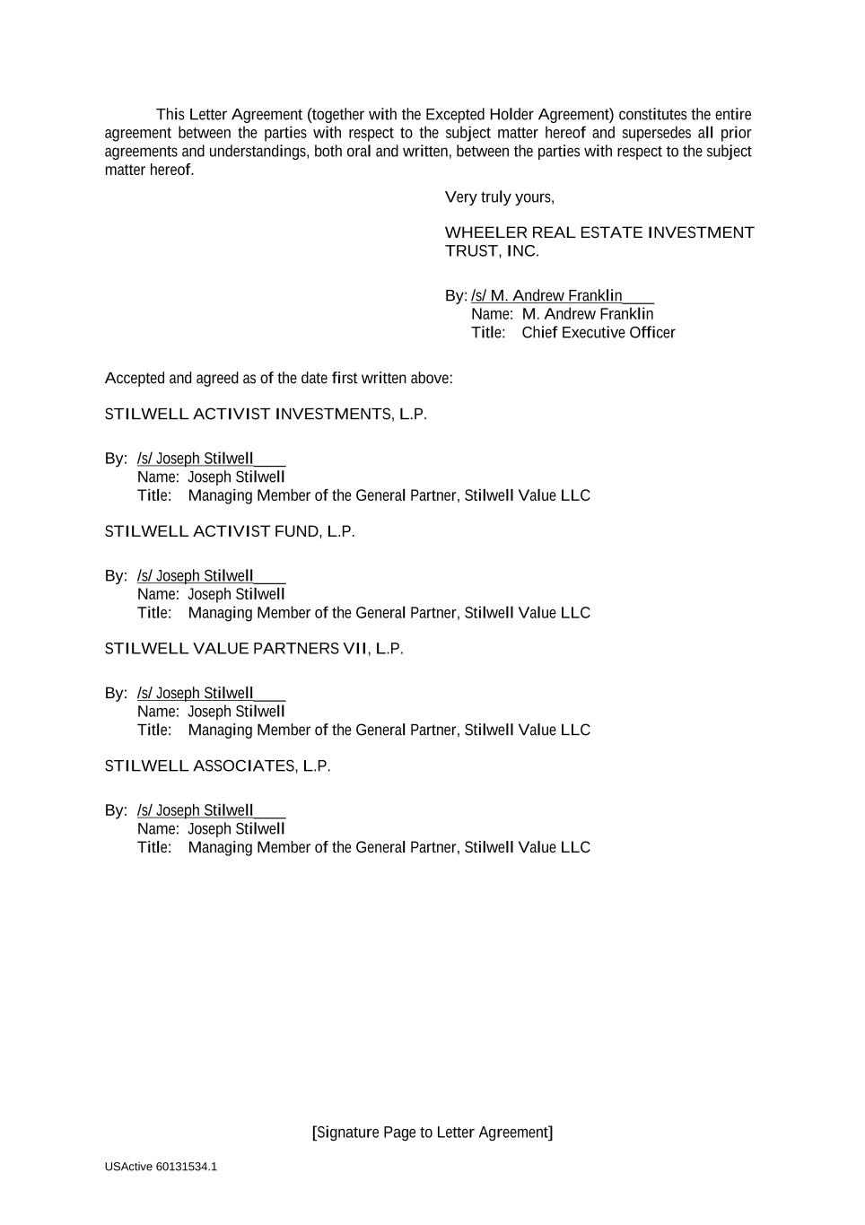 [Signature Page to Letter Agreement] USActive 60131534.1 This Letter Agreement (together with the Excepted Holder Agreement) constitutes the entire agreement between the parties with respect to the subject matter hereof and supersedes all prior agreements and understandings, both oral and written, between the parties with respect to the subject matter hereof. Very truly yours, WHEELER REAL ESTATE INVESTMENT TRUST, INC. By: /s/ M. Andrew Franklin____ Name: M. Andrew Franklin Title: Chief Executive Officer Accepted and agreed as of the date first written above: STILWELL ACTIVIST INVESTMENTS, L.P. By: /s/ Joseph Stilwell____ Name: Joseph Stilwell Title: Managing Member of the General Partner, Stilwell Value LLC STILWELL ACTIVIST FUND, L.P. By: /s/ Joseph Stilwell____ Name: Joseph Stilwell Title: Managing Member of the General Partner, Stilwell Value LLC STILWELL VALUE PARTNERS VII, L.P. By: /s/ Joseph Stilwell____ Name: Joseph Stilwell Title: Managing Member of the General Partner, Stilwell Value LLC STILWELL ASSOCIATES, L.P. By: /s/ Joseph Stilwell____ Name: Joseph Stilwell Title: Managing Member of the General Partner, Stilwell Value LLC