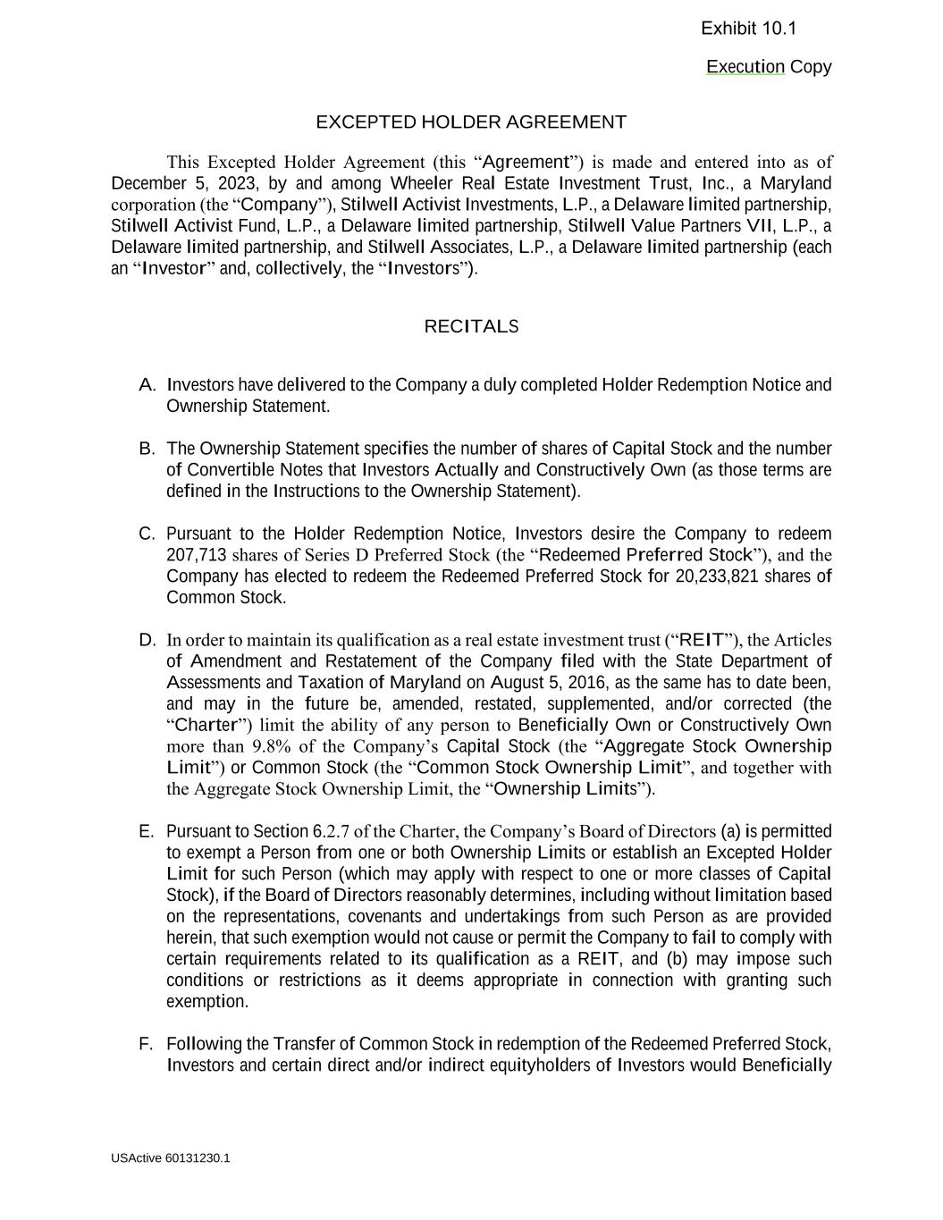 Execution Copy USActive 60131230.1 EXCEPTED HOLDER AGREEMENT This Excepted Holder Agreement (this “Agreement”) is made and entered into as of December 5, 2023, by and among Wheeler Real Estate Investment Trust, Inc., a Maryland corporation (the “Company”), Stilwell Activist Investments, L.P., a Delaware limited partnership, Stilwell Activist Fund, L.P., a Delaware limited partnership, Stilwell Value Partners VII, L.P., a Delaware limited partnership, and Stilwell Associates, L.P., a Delaware limited partnership (each an “Investor” and, collectively, the “Investors”). RECITALS A. Investors have delivered to the Company a duly completed Holder Redemption Notice and Ownership Statement. B. The Ownership Statement specifies the number of shares of Capital Stock and the number of Convertible Notes that Investors Actually and Constructively Own (as those terms are defined in the Instructions to the Ownership Statement). C. Pursuant to the Holder Redemption Notice, Investors desire the Company to redeem 207,713 shares of Series D Preferred Stock (the “Redeemed Preferred Stock”), and the Company has elected to redeem the Redeemed Preferred Stock for 20,233,821 shares of Common Stock. D. In order to maintain its qualification as a real estate investment trust (“REIT”), the Articles of Amendment and Restatement of the Company filed with the State Department of Assessments and Taxation of Maryland on August 5, 2016, as the same has to date been, and may in the future be, amended, restated, supplemented, and/or corrected (the “Charter”) limit the ability of any person to Beneficially Own or Constructively Own more than 9.8% of the Company’s Capital Stock (the “Aggregate Stock Ownership Limit”) or Common Stock (the “Common Stock Ownership Limit”, and together with the Aggregate Stock Ownership Limit, the “Ownership Limits”). E. Pursuant to Section 6.2.7 of the Charter, the Company’s Board of Directors (a) is permitted to exempt a Person from one or both Ownership Limits or establish an Excepted Holder Limit for such Person (which may apply with respect to one or more classes of Capital Stock), if the Board of Directors reasonably determines, including without limitation based on the representations, covenants and undertakings from such Person as are provided herein, that such exemption would not cause or permit the Company to fail to comply with certain requirements related to its qualification as a REIT, and (b) may impose such conditions or restrictions as it deems appropriate in connection with granting such exemption. F. Following the Transfer of Common Stock in redemption of the Redeemed Preferred Stock, Investors and certain direct and/or indirect equityholders of Investors would Beneficially Exhibit 10.1