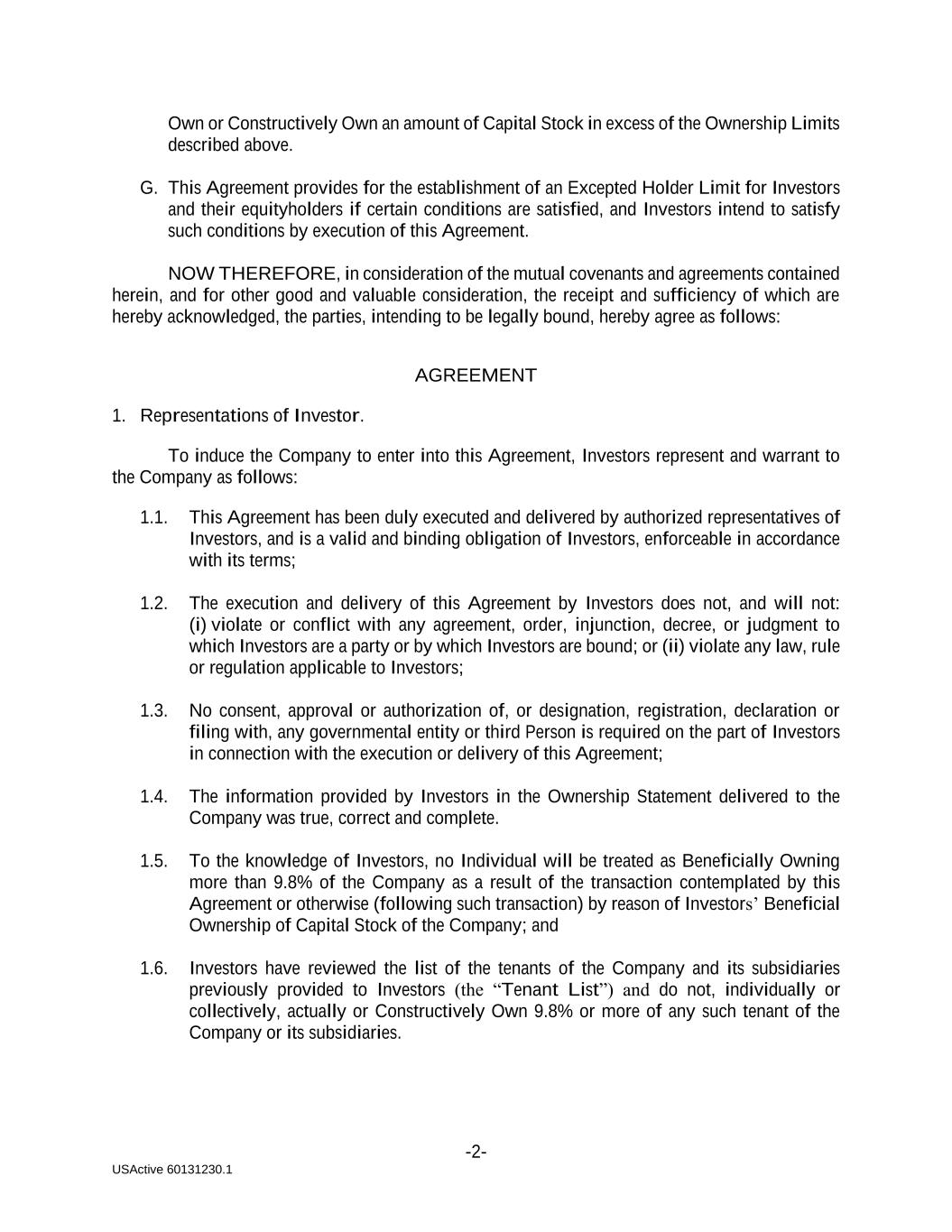 -2- USActive 60131230.1 Own or Constructively Own an amount of Capital Stock in excess of the Ownership Limits described above. G. This Agreement provides for the establishment of an Excepted Holder Limit for Investors and their equityholders if certain conditions are satisfied, and Investors intend to satisfy such conditions by execution of this Agreement. NOW THEREFORE, in consideration of the mutual covenants and agreements contained herein, and for other good and valuable consideration, the receipt and sufficiency of which are hereby acknowledged, the parties, intending to be legally bound, hereby agree as follows: AGREEMENT 1. Representations of Investor. To induce the Company to enter into this Agreement, Investors represent and warrant to the Company as follows: 1.1. This Agreement has been duly executed and delivered by authorized representatives of Investors, and is a valid and binding obligation of Investors, enforceable in accordance with its terms; 1.2. The execution and delivery of this Agreement by Investors does not, and will not: (i) violate or conflict with any agreement, order, injunction, decree, or judgment to which Investors are a party or by which Investors are bound; or (ii) violate any law, rule or regulation applicable to Investors; 1.3. No consent, approval or authorization of, or designation, registration, declaration or filing with, any governmental entity or third Person is required on the part of Investors in connection with the execution or delivery of this Agreement; 1.4. The information provided by Investors in the Ownership Statement delivered to the Company was true, correct and complete. 1.5. To the knowledge of Investors, no Individual will be treated as Beneficially Owning more than 9.8% of the Company as a result of the transaction contemplated by this Agreement or otherwise (following such transaction) by reason of Investors’ Beneficial Ownership of Capital Stock of the Company; and 1.6. Investors have reviewed the list of the tenants of the Company and its subsidiaries previously provided to Investors (the “Tenant List”) and do not, individually or collectively, actually or Constructively Own 9.8% or more of any such tenant of the Company or its subsidiaries.