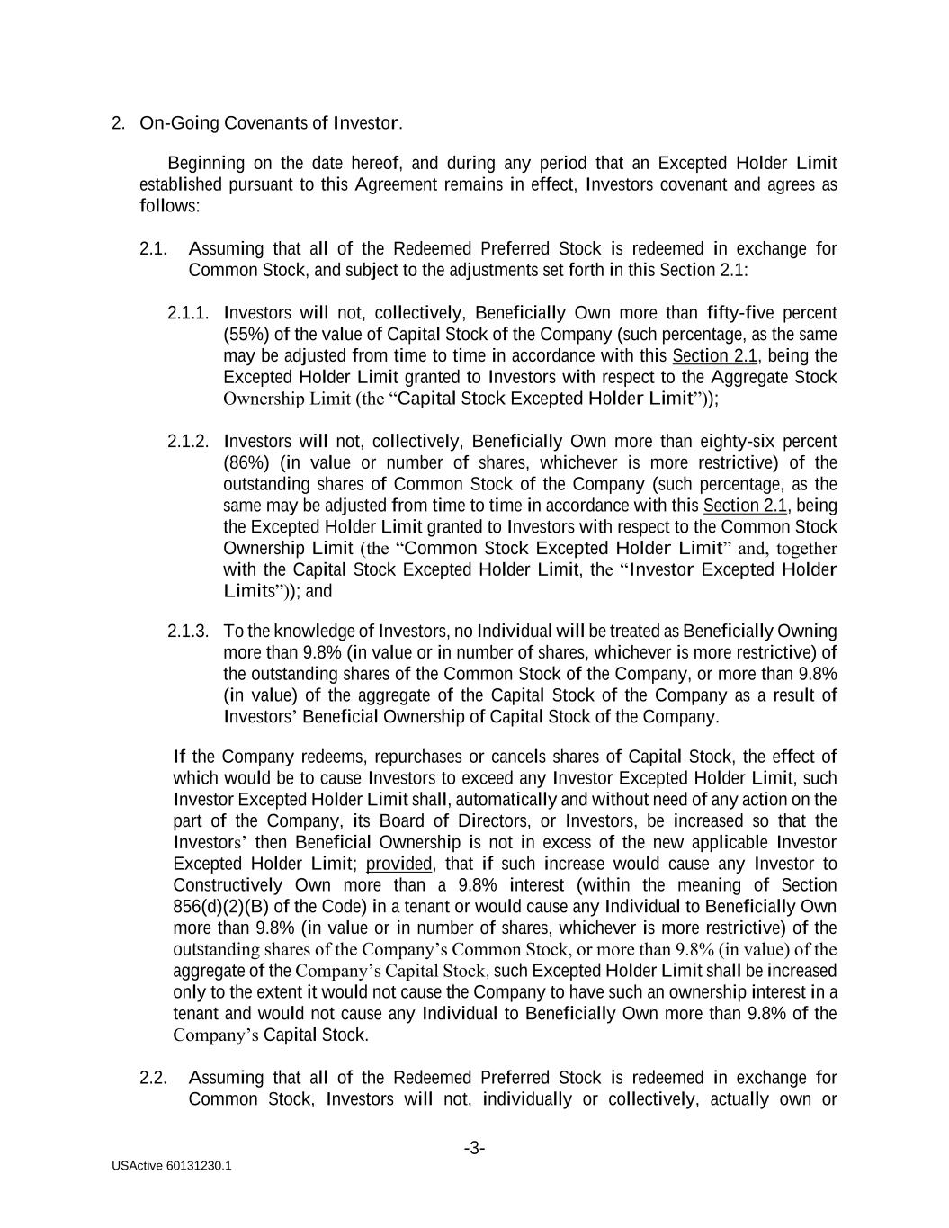 -3- USActive 60131230.1 2. On-Going Covenants of Investor. Beginning on the date hereof, and during any period that an Excepted Holder Limit established pursuant to this Agreement remains in effect, Investors covenant and agrees as follows: 2.1. Assuming that all of the Redeemed Preferred Stock is redeemed in exchange for Common Stock, and subject to the adjustments set forth in this Section 2.1: 2.1.1. Investors will not, collectively, Beneficially Own more than fifty-five percent (55%) of the value of Capital Stock of the Company (such percentage, as the same may be adjusted from time to time in accordance with this Section 2.1, being the Excepted Holder Limit granted to Investors with respect to the Aggregate Stock Ownership Limit (the “Capital Stock Excepted Holder Limit”)); 2.1.2. Investors will not, collectively, Beneficially Own more than eighty-six percent (86%) (in value or number of shares, whichever is more restrictive) of the outstanding shares of Common Stock of the Company (such percentage, as the same may be adjusted from time to time in accordance with this Section 2.1, being the Excepted Holder Limit granted to Investors with respect to the Common Stock Ownership Limit (the “Common Stock Excepted Holder Limit” and, together with the Capital Stock Excepted Holder Limit, the “Investor Excepted Holder Limits”)); and 2.1.3. To the knowledge of Investors, no Individual will be treated as Beneficially Owning more than 9.8% (in value or in number of shares, whichever is more restrictive) of the outstanding shares of the Common Stock of the Company, or more than 9.8% (in value) of the aggregate of the Capital Stock of the Company as a result of Investors’ Beneficial Ownership of Capital Stock of the Company. If the Company redeems, repurchases or cancels shares of Capital Stock, the effect of which would be to cause Investors to exceed any Investor Excepted Holder Limit, such Investor Excepted Holder Limit shall, automatically and without need of any action on the part of the Company, its Board of Directors, or Investors, be increased so that the Investors’ then Beneficial Ownership is not in excess of the new applicable Investor Excepted Holder Limit; provided, that if such increase would cause any Investor to Constructively Own more than a 9.8% interest (within the meaning of Section 856(d)(2)(B) of the Code) in a tenant or would cause any Individual to Beneficially Own more than 9.8% (in value or in number of shares, whichever is more restrictive) of the outstanding shares of the Company’s Common Stock, or more than 9.8% (in value) of the aggregate of the Company’s Capital Stock, such Excepted Holder Limit shall be increased only to the extent it would not cause the Company to have such an ownership interest in a tenant and would not cause any Individual to Beneficially Own more than 9.8% of the Company’s Capital Stock. 2.2. Assuming that all of the Redeemed Preferred Stock is redeemed in exchange for Common Stock, Investors will not, individually or collectively, actually own or