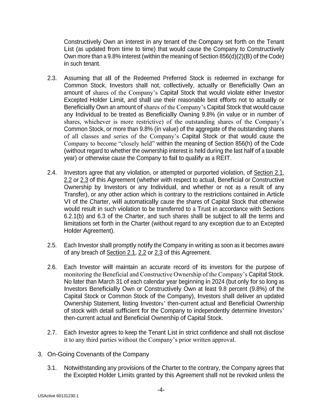 -4- USActive 60131230.1 Constructively Own an interest in any tenant of the Company set forth on the Tenant List (as updated from time to time) that would cause the Company to Constructively Own more than a 9.8% interest (within the meaning of Section 856(d)(2)(B) of the Code) in such tenant. 2.3. Assuming that all of the Redeemed Preferred Stock is redeemed in exchange for Common Stock, Investors shall not, collectively, actually or Beneficially Own an amount of shares of the Company’s Capital Stock that would violate either Investor Excepted Holder Limit, and shall use their reasonable best efforts not to actually or Beneficially Own an amount of shares of the Company’s Capital Stock that would cause any Individual to be treated as Beneficially Owning 9.8% (in value or in number of shares, whichever is more restrictive) of the outstanding shares of the Company’s Common Stock, or more than 9.8% (in value) of the aggregate of the outstanding shares of all classes and series of the Company’s Capital Stock or that would cause the Company to become “closely held” within the meaning of Section 856(h) of the Code (without regard to whether the ownership interest is held during the last half of a taxable year) or otherwise cause the Company to fail to qualify as a REIT. 2.4. Investors agree that any violation, or attempted or purported violation, of Section 2.1, 2.2 or 2.3 of this Agreement (whether with respect to actual, Beneficial or Constructive Ownership by Investors or any Individual, and whether or not as a result of any Transfer), or any other action which is contrary to the restrictions contained in Article VI of the Charter, will automatically cause the shares of Capital Stock that otherwise would result in such violation to be transferred to a Trust in accordance with Sections 6.2.1(b) and 6.3 of the Charter, and such shares shall be subject to all the terms and limitations set forth in the Charter (without regard to any exception due to an Excepted Holder Agreement). 2.5. Each Investor shall promptly notify the Company in writing as soon as it becomes aware of any breach of Section 2.1, 2.2 or 2.3 of this Agreement. 2.6. Each Investor will maintain an accurate record of its investors for the purpose of monitoring the Beneficial and Constructive Ownership of the Company’s Capital Stock. No later than March 31 of each calendar year beginning in 2024 (but only for so long as Investors Beneficially Own or Constructively Own at least 9.8 percent (9.8%) of the Capital Stock or Common Stock of the Company), Investors shall deliver an updated Ownership Statement, listing Investors’ then-current actual and Beneficial Ownership of stock with detail sufficient for the Company to independently determine Investors’ then-current actual and Beneficial Ownership of Capital Stock. 2.7. Each Investor agrees to keep the Tenant List in strict confidence and shall not disclose it to any third parties without the Company’s prior written approval. 3. On-Going Covenants of the Company 3.1. Notwithstanding any provisions of the Charter to the contrary, the Company agrees that the Excepted Holder Limits granted by this Agreement shall not be revoked unless the