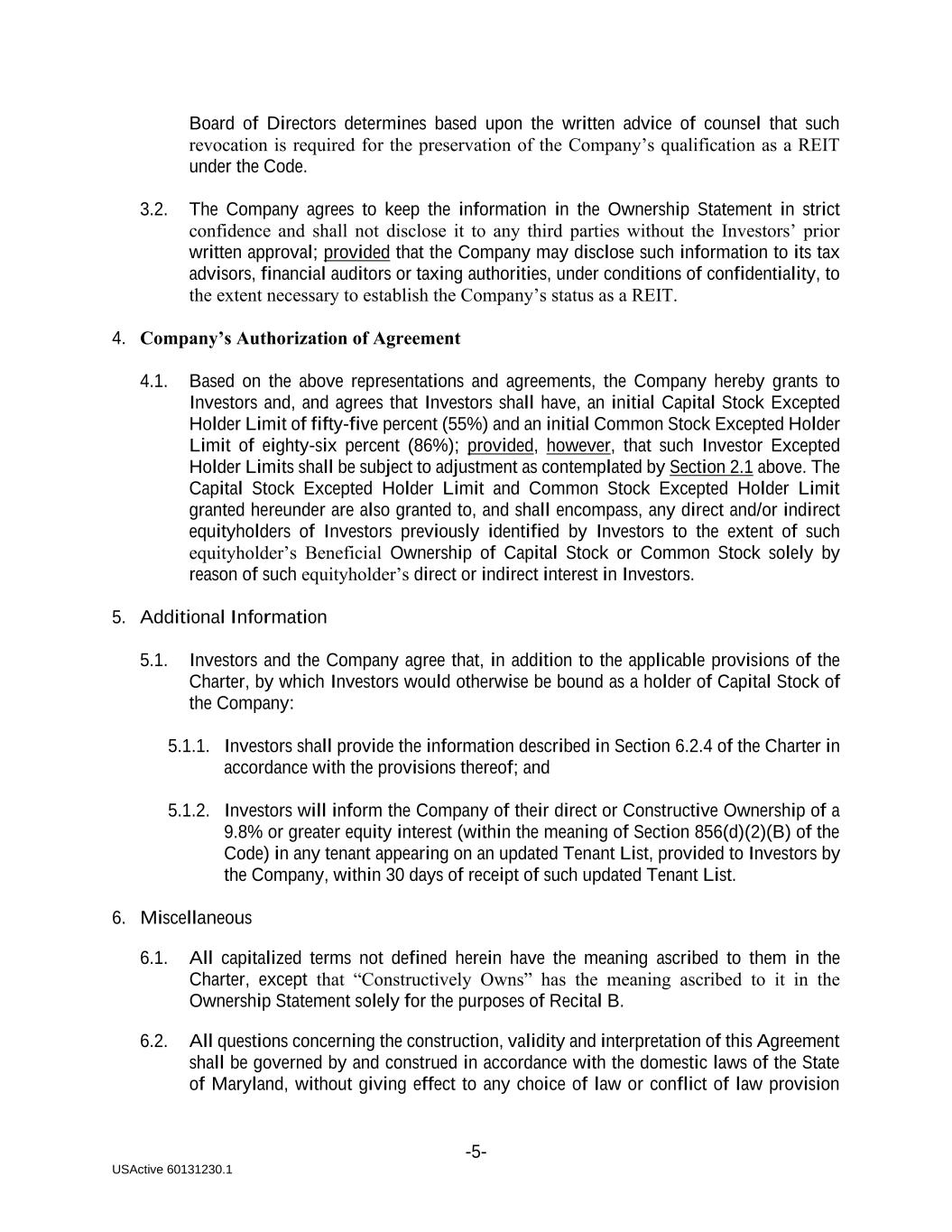 -5- USActive 60131230.1 Board of Directors determines based upon the written advice of counsel that such revocation is required for the preservation of the Company’s qualification as a REIT under the Code. 3.2. The Company agrees to keep the information in the Ownership Statement in strict confidence and shall not disclose it to any third parties without the Investors’ prior written approval; provided that the Company may disclose such information to its tax advisors, financial auditors or taxing authorities, under conditions of confidentiality, to the extent necessary to establish the Company’s status as a REIT. 4. Company’s Authorization of Agreement 4.1. Based on the above representations and agreements, the Company hereby grants to Investors and, and agrees that Investors shall have, an initial Capital Stock Excepted Holder Limit of fifty-five percent (55%) and an initial Common Stock Excepted Holder Limit of eighty-six percent (86%); provided, however, that such Investor Excepted Holder Limits shall be subject to adjustment as contemplated by Section 2.1 above. The Capital Stock Excepted Holder Limit and Common Stock Excepted Holder Limit granted hereunder are also granted to, and shall encompass, any direct and/or indirect equityholders of Investors previously identified by Investors to the extent of such equityholder’s Beneficial Ownership of Capital Stock or Common Stock solely by reason of such equityholder’s direct or indirect interest in Investors. 5. Additional Information 5.1. Investors and the Company agree that, in addition to the applicable provisions of the Charter, by which Investors would otherwise be bound as a holder of Capital Stock of the Company: 5.1.1. Investors shall provide the information described in Section 6.2.4 of the Charter in accordance with the provisions thereof; and 5.1.2. Investors will inform the Company of their direct or Constructive Ownership of a 9.8% or greater equity interest (within the meaning of Section 856(d)(2)(B) of the Code) in any tenant appearing on an updated Tenant List, provided to Investors by the Company, within 30 days of receipt of such updated Tenant List. 6. Miscellaneous 6.1. All capitalized terms not defined herein have the meaning ascribed to them in the Charter, except that “Constructively Owns” has the meaning ascribed to it in the Ownership Statement solely for the purposes of Recital B. 6.2. All questions concerning the construction, validity and interpretation of this Agreement shall be governed by and construed in accordance with the domestic laws of the State of Maryland, without giving effect to any choice of law or conflict of law provision