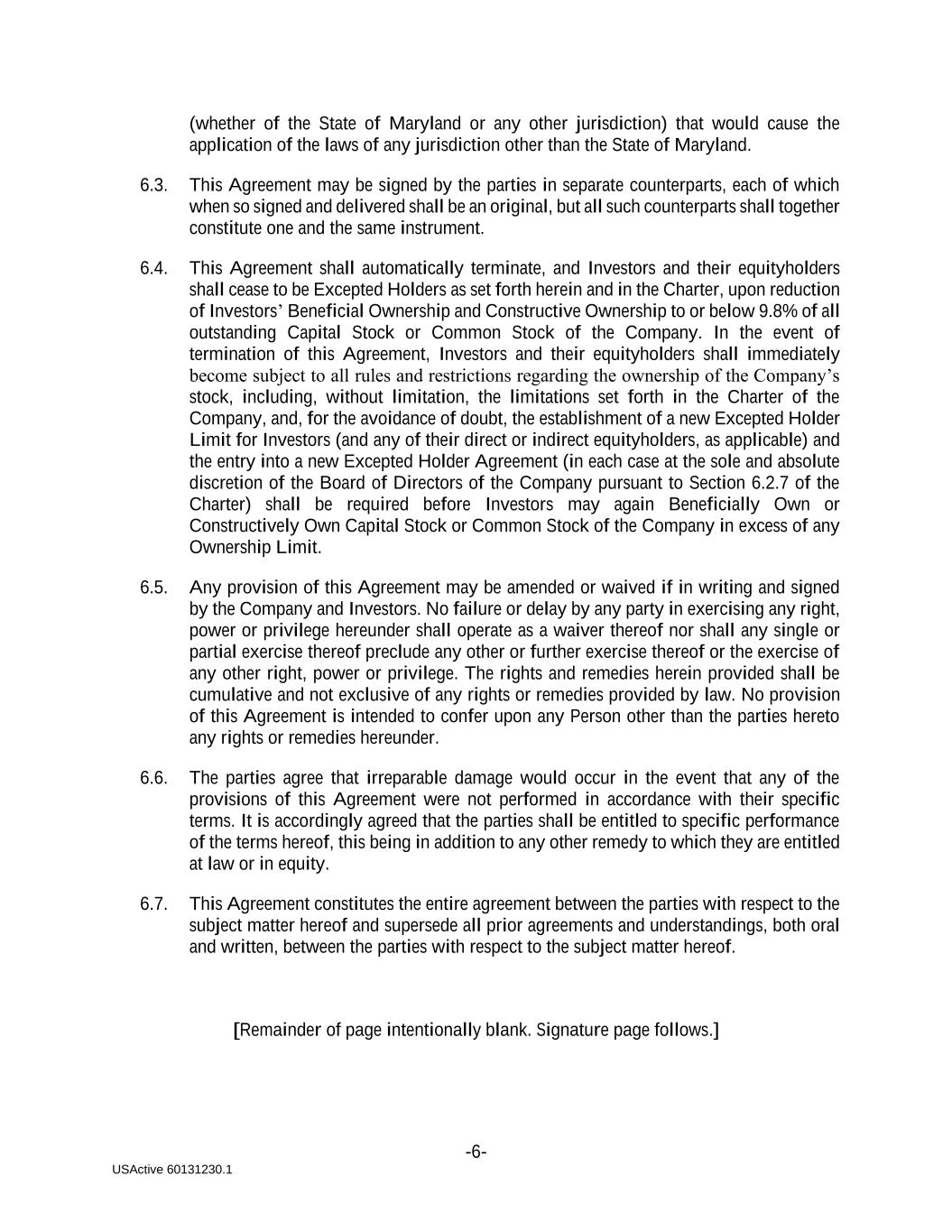 -6- USActive 60131230.1 (whether of the State of Maryland or any other jurisdiction) that would cause the application of the laws of any jurisdiction other than the State of Maryland. 6.3. This Agreement may be signed by the parties in separate counterparts, each of which when so signed and delivered shall be an original, but all such counterparts shall together constitute one and the same instrument. 6.4. This Agreement shall automatically terminate, and Investors and their equityholders shall cease to be Excepted Holders as set forth herein and in the Charter, upon reduction of Investors’ Beneficial Ownership and Constructive Ownership to or below 9.8% of all outstanding Capital Stock or Common Stock of the Company. In the event of termination of this Agreement, Investors and their equityholders shall immediately become subject to all rules and restrictions regarding the ownership of the Company’s stock, including, without limitation, the limitations set forth in the Charter of the Company, and, for the avoidance of doubt, the establishment of a new Excepted Holder Limit for Investors (and any of their direct or indirect equityholders, as applicable) and the entry into a new Excepted Holder Agreement (in each case at the sole and absolute discretion of the Board of Directors of the Company pursuant to Section 6.2.7 of the Charter) shall be required before Investors may again Beneficially Own or Constructively Own Capital Stock or Common Stock of the Company in excess of any Ownership Limit. 6.5. Any provision of this Agreement may be amended or waived if in writing and signed by the Company and Investors. No failure or delay by any party in exercising any right, power or privilege hereunder shall operate as a waiver thereof nor shall any single or partial exercise thereof preclude any other or further exercise thereof or the exercise of any other right, power or privilege. The rights and remedies herein provided shall be cumulative and not exclusive of any rights or remedies provided by law. No provision of this Agreement is intended to confer upon any Person other than the parties hereto any rights or remedies hereunder. 6.6. The parties agree that irreparable damage would occur in the event that any of the provisions of this Agreement were not performed in accordance with their specific terms. It is accordingly agreed that the parties shall be entitled to specific performance of the terms hereof, this being in addition to any other remedy to which they are entitled at law or in equity. 6.7. This Agreement constitutes the entire agreement between the parties with respect to the subject matter hereof and supersede all prior agreements and understandings, both oral and written, between the parties with respect to the subject matter hereof. [Remainder of page intentionally blank. Signature page follows.]