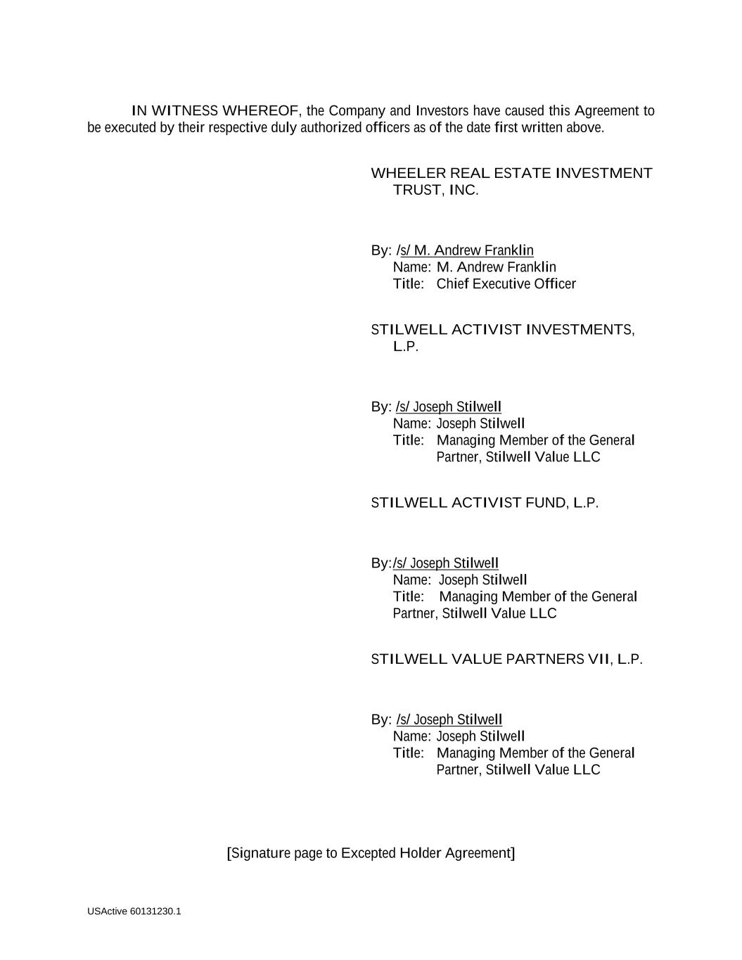 USActive 60131230.1 IN WITNESS WHEREOF, the Company and Investors have caused this Agreement to be executed by their respective duly authorized officers as of the date first written above. WHEELER REAL ESTATE INVESTMENT TRUST, INC. By: /s/ M. Andrew Franklin Name: M. Andrew Franklin Title: Chief Executive Officer STILWELL ACTIVIST INVESTMENTS, L.P. By: /s/ Joseph Stilwell Name: Joseph Stilwell Title: Managing Member of the General Partner, Stilwell Value LLC STILWELL ACTIVIST FUND, L.P. By: /s/ Joseph Stilwell Name: Joseph Stilwell Title: Managing Member of the General Partner, Stilwell Value LLC STILWELL VALUE PARTNERS VII, L.P. By: /s/ Joseph Stilwell Name: Joseph Stilwell Title: Managing Member of the General Partner, Stilwell Value LLC [Signature page to Excepted Holder Agreement]